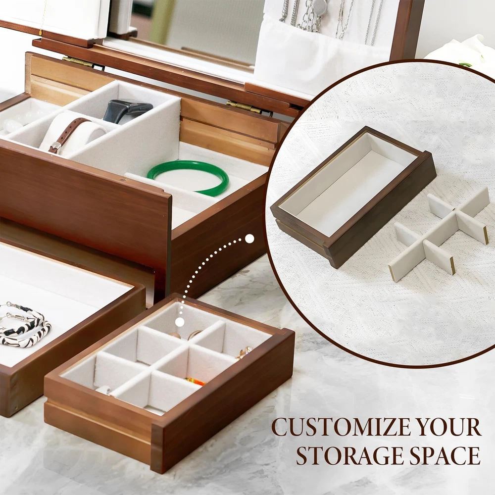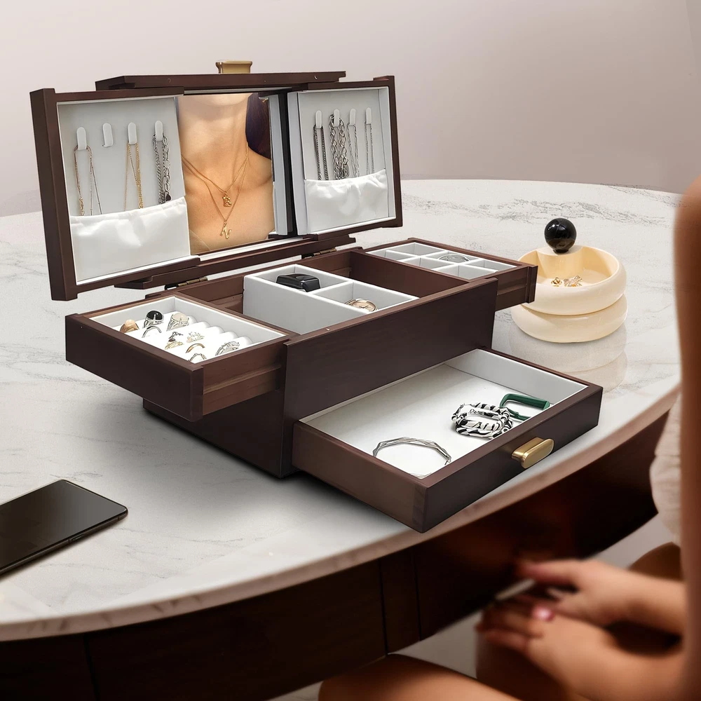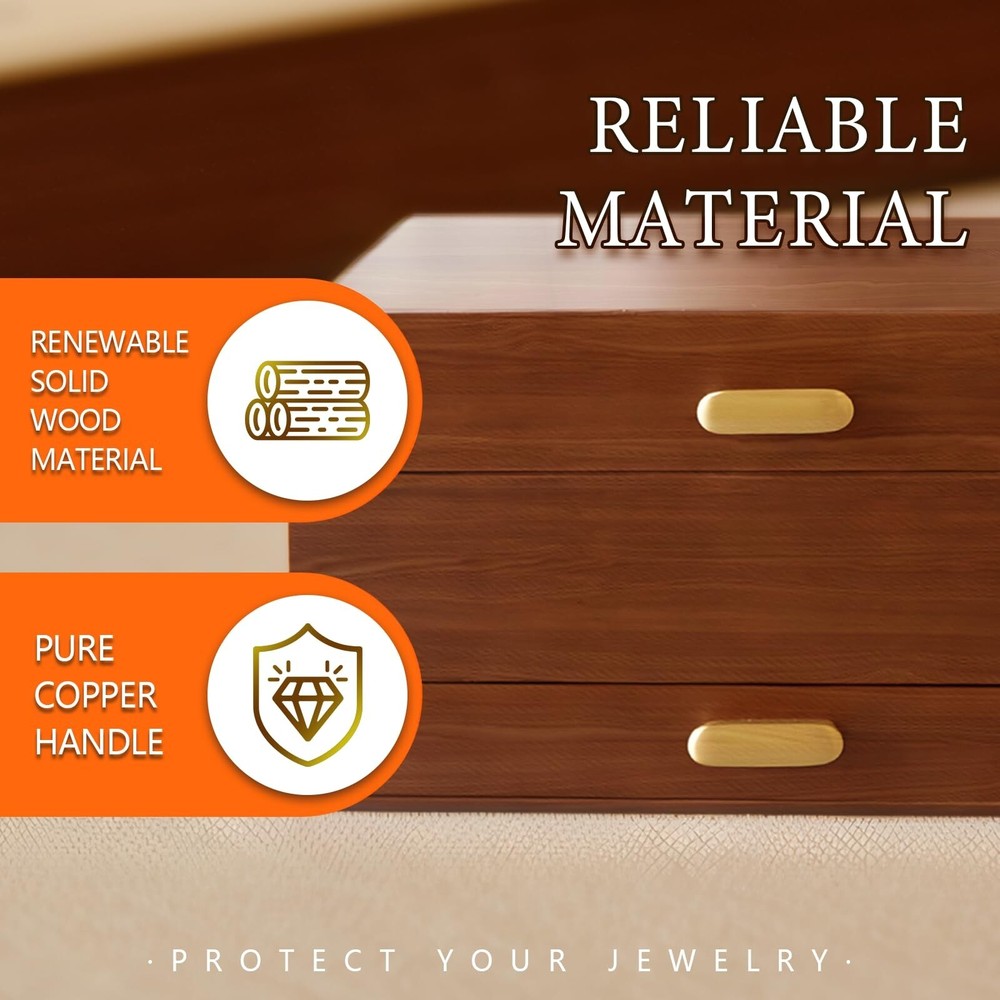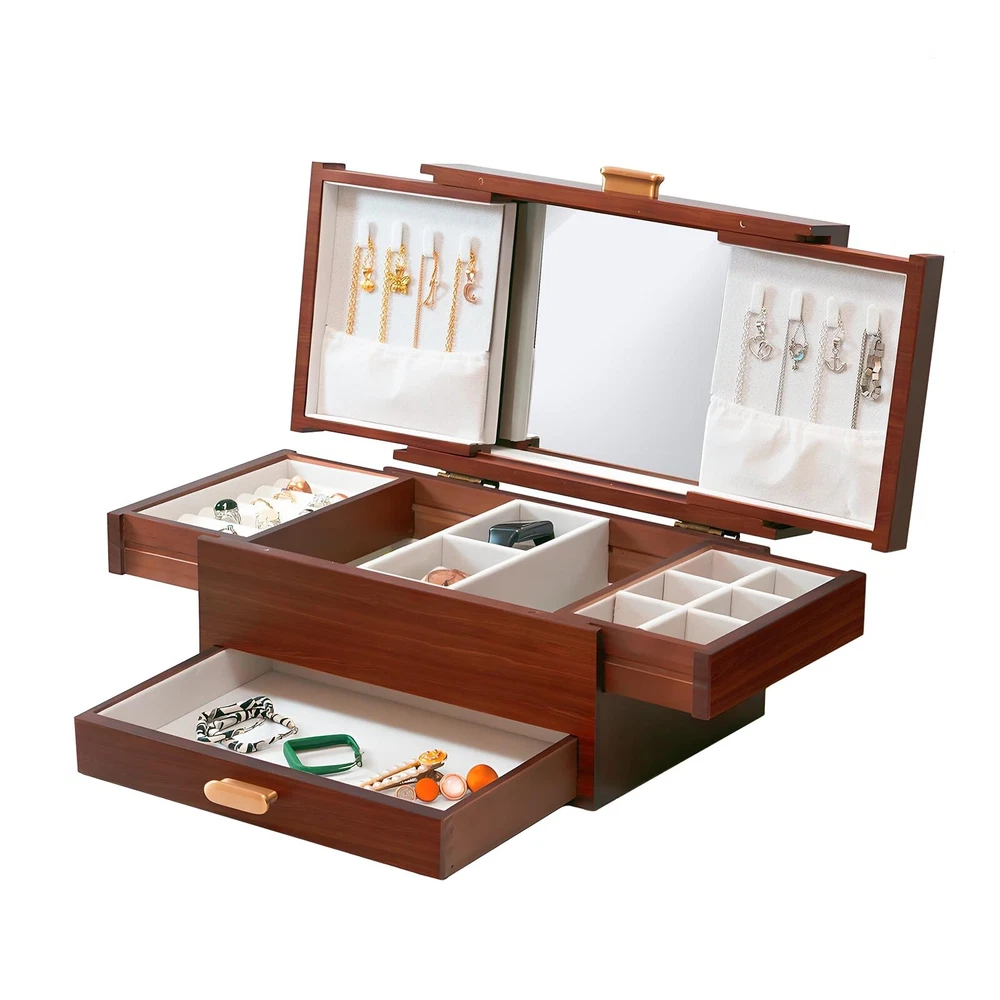 Jewelry Box Solid Wood Jewelry Box Jewelry Ring Necklace Watches Earrings And Other Multi-style Storage Organizer Girl Wife Mother Gifts - Buy Now with Fast Shipping! Jewelry Box Solid Wood Jewelry Box Jewelry Ring Necklace Watches Earrings And Other Multi-style Storage Organizer Girl Wife Mother Gifts Product Details Color: Vintage red Brand: FMYSUSUXY Material: Wood Style: Antique Special Feature: Anti-Tarnish, Dustproof, Foldable, Scratch Resistant Recommended Uses For Product: Necklace, Bracelet, Ring, Watch, Earring, Bangle Product Dimensions: 8"D x 12"W x 6.6"H Target Audience: Women, Men, Girls Shape: Rectangular Finish Type: Lacquered Color: ‎Vintage red Brand: ‎FMYSUSUXY Material: ‎Wood Style: ‎Antique Special Feature: ‎Anti-Tarnish, Dustproof, Foldable, Scratch Resistant Recommended Uses For Product: ‎Necklace, Bracelet, Ring, Watch, Earring, Bangle Product Dimensions: ‎8"D x 12"W x 6.6"H Target Audience: ‎Women, Men, Girls Shape: ‎Rectangular Finish Type: ‎Lacquered Inner Material: ‎Velvet Number of Drawers: ‎5 Number of Compartments: ‎8 Jewelry Storage Type: ‎Jewelry Box Manufacturer: ‎FMYSUSUXY Occasion: ‎Mother's Day, Engagement, Christmas, Birthday, Valentine's Day Mounting Type: ‎Table Top Closure Type: ‎Latch Item Weight: ‎6.84 pounds Country of Origin: ‎China Item model number: ‎big1 Finish: ‎Lacquered Special Features: ‎Anti-Tarnish, Dustproof, Foldable, Scratch Resistant Included Components: ‎jewelry box Batteries Included?: ‎No Batteries Required?: ‎No Date First Available: July 13, 2024 Key Features ✅ Large capacity jewelry box with mirror:Made of renewable solid wood and covered with soft velvet inside, it is a large -capacity high-end luxury jewelry box that perfectly protects your jewelry ✅ Pure copper handle:The shape is simple, oval, comfortable to touch, pure copper. Anti-oxidation. Rust proof ✅ Efficient storage and dressing:The jewelry box comes with a makeup mirror, you can effectively choose accessories according to your wear, and you can hang necklaces on both sides.The second layer can be freely retracted on both sides, with hidden storage space, separate watch ring and other placing areas.The third floor is a space designed for large bracelets. ✅ The best gift to give:The jewelry box can store a variety of jewelry, convenient storage, is the best birthday gift or surprise for yourself, friends, or family, and can also be used as an ornament, with great collection value ✅ Optimum size:Jewelry box 12''L x 8''W x 6.6''H, Expansion size 21.5''L x 10''W x 12.6''H Product Description