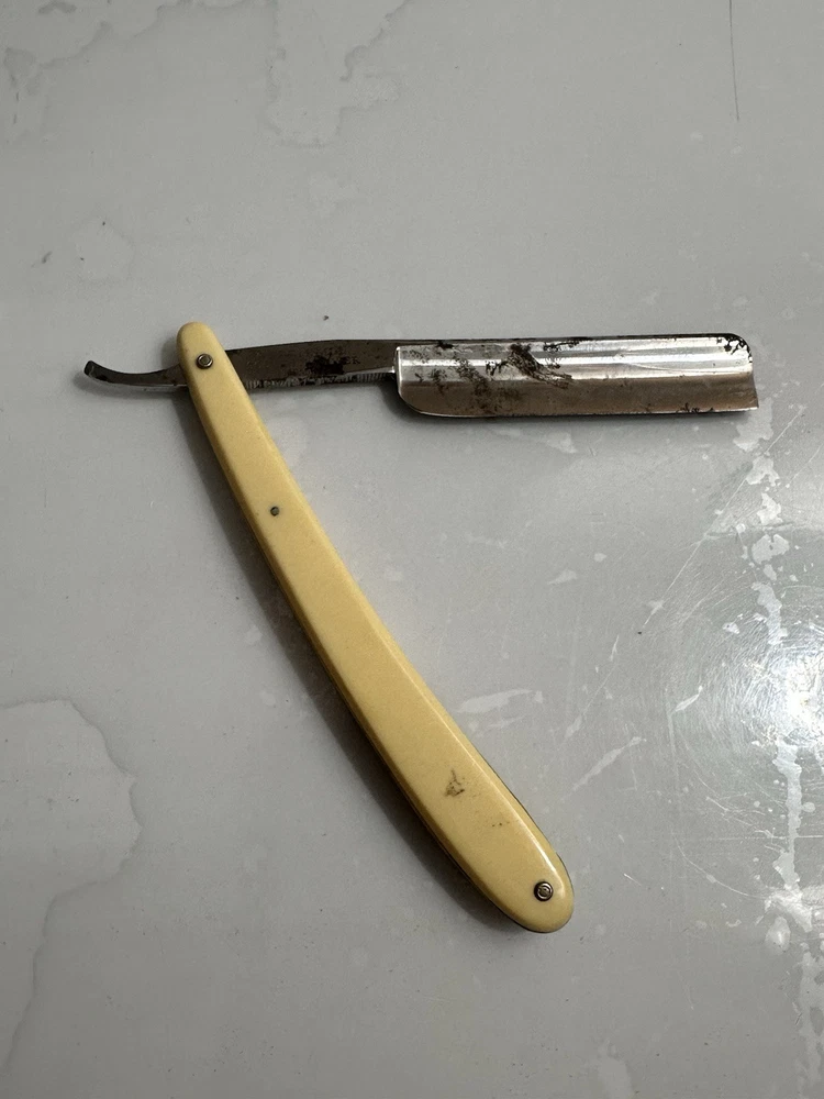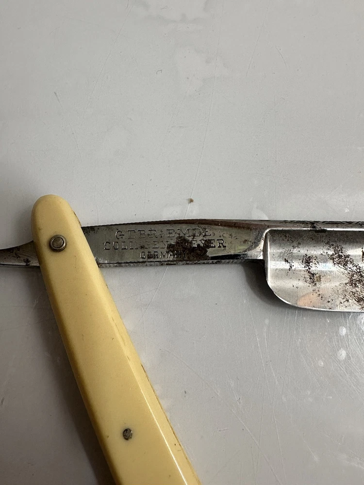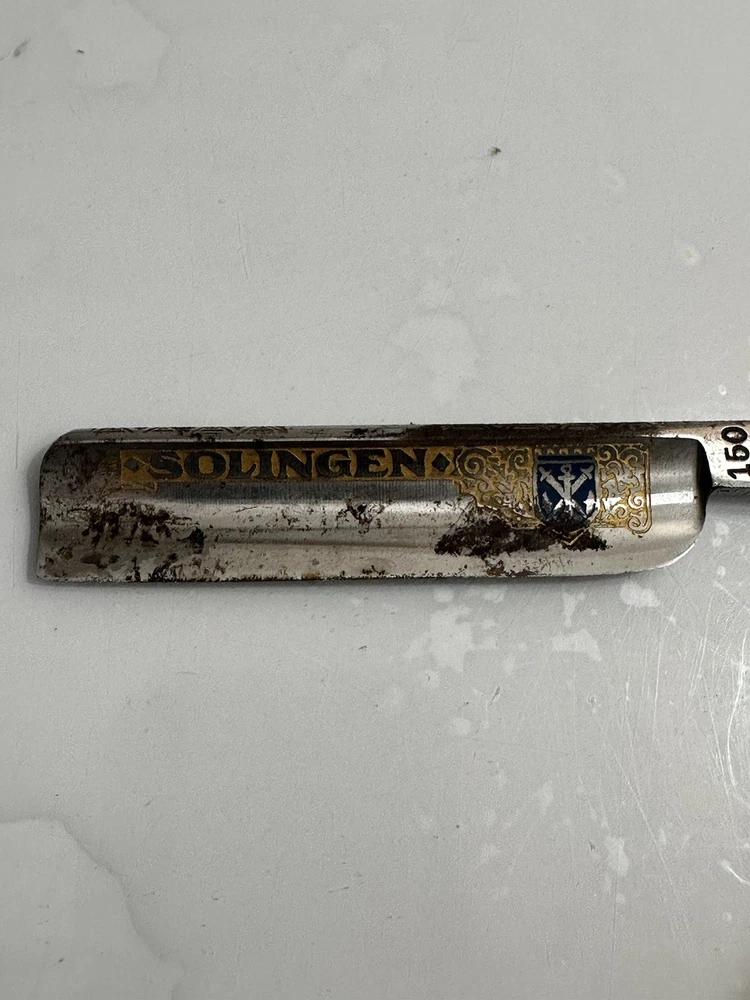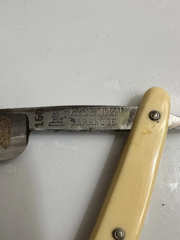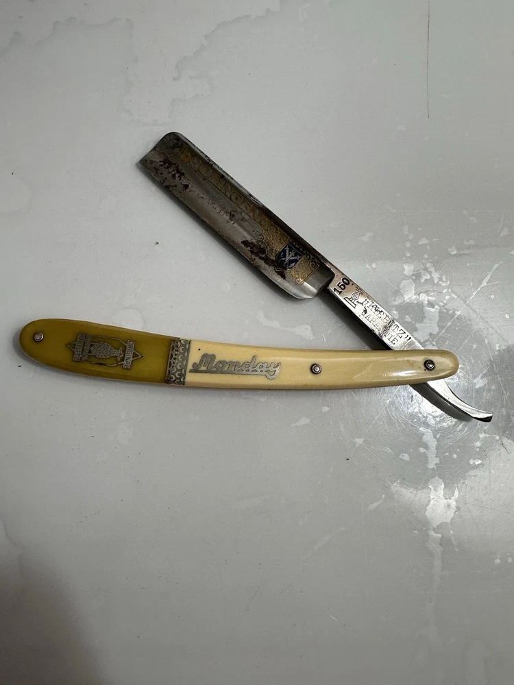 The Solingen Kiebitz 150 Monday Straight Razor is a high-quality shaving tool manufactured in Germany. It features an inlaid yellow and white handle, adding a touch of elegance to its design. This straight razor is designed for precision shaving and is a valuable addition to any shaving enthusiast's collection. The Solingen brand is well-known for producing top-notch shaving products, and this razor is no exception, showcasing German craftsmanship and quality.