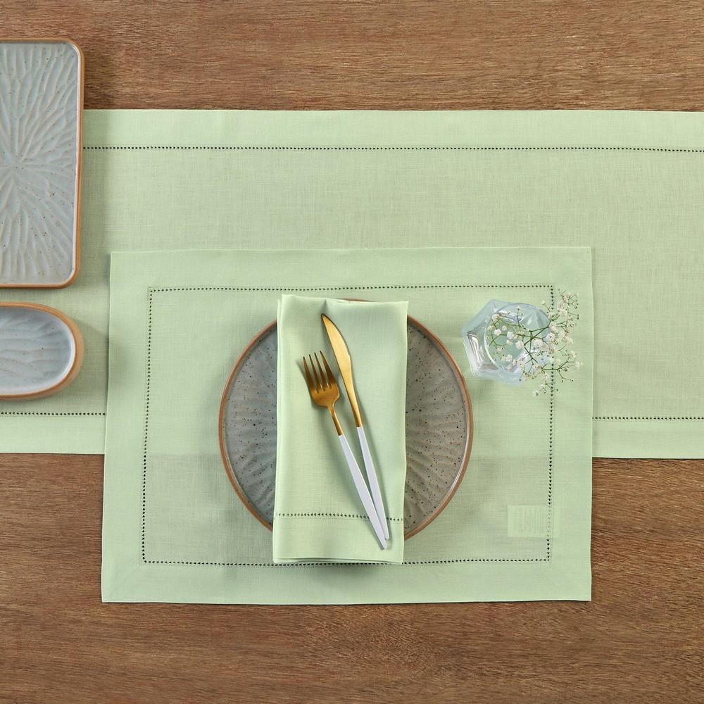 A pure linen classic, this hand-crafted Long Table Runner from our Hemstitch Collection is woven of 100% linen and is as soft and luxurious as the vintage classic heirloom linens that inspired them. Each runner is beautifully edged with an intricate hemstitched border, tailored with a one-inch hem and mitered corners and made especially for long tables up to 156". Like all fine linens and textiles, the Hemstitch collection mellows with each washing, bringing it a wonderful heirloom feel About this item 100% Pure European Flax Linen Table Runner - Classic Hemstitch | Handcrafted By Skilled Artisans Size - 14 x 120 Inches Long Table Runner; Color - Light Green Hemstitch Table Runner | Available in Variety of Sizes and Colors Easy Care - Machine Washable, Low Iron as Needed, Steam Iron for a crisp look. The beauty of each pure linen piece is the natural fibers and classic aesthetic that mellows with each washing, betters with age and requires minimal care Like all fine linens and textiles, each batch of our linen is different and unique. Slight color, texture variations and wrinkles are an inherent quality of 100% pure linen handcrafted pieces, adding to their relaxed beauty and bringing a wonderful heirloom feel to each Create a monochromatic or mix n’match look to fit your style with our coordinating products from this collection. Available in colors, sizes and styles for celebrating weddings, bridal showers, baby showers and special occasions, entertaining for Easter, Passover, Memorial Day, 4th of July, Labor Day "To explore even more categories and find everything you need, visit our Solino Home store today!"