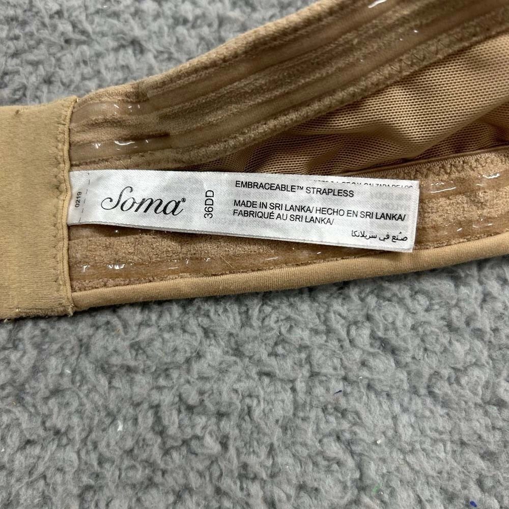 Vintage: NO Pattern: Solid Opacity: Opaque Fabric Type: Woven Strap Type: Strapless Garment Care: Hand Wash Only Season: Spring, Summer, Fall, Winter Brand: Soma Size: 36DD Cup Size: DD Band Size: 36 Closure: Hook & Eye Material: Nylon Blend Color: Beige Department: Women Product Line: Embraceable Strapless Type: Bra Style: T-Shirt Bra Underwire Type: Underwired