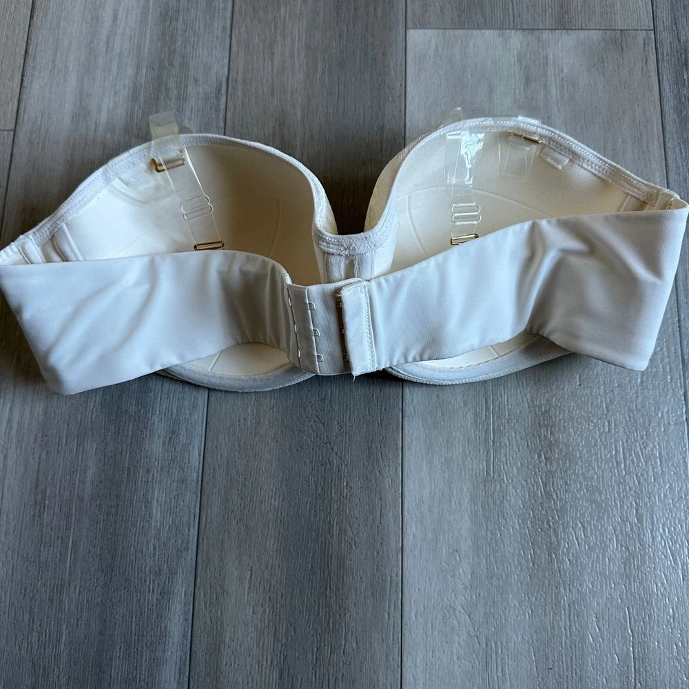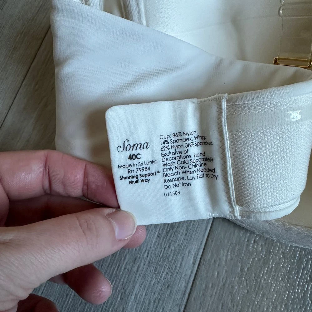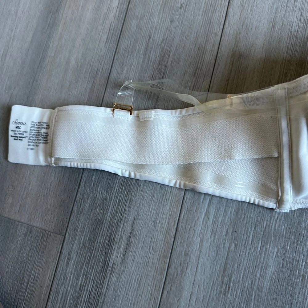 Soma Stunning Support Strapless Bra Womens 40C Multi Way Adjustable White Floral Previously loved but in good condition. Sold out online. Comes with clear straps. See photos. Comes from smoke free and pet friendly home. Stunning Support offers the lift and support you need with the beauty you deserve. Gorgeous strapless bra that can be worn as a multi way bra with exclusive 3-Zone Support lifts, shapes and smooths you. Fully adjustable and removable matching straps. Wear strapless, halter, crisscross for racerback styling, center halter, traditional and more. Smooth and beautifully engineered lace does not show under clothing. Contour foam cups support and are totally seamless. Underwire. Wide super soft and powerful elastic with silicon. Stay put band. Cushioned hook and eye closure. 86% nylon, 14% spandex. Hand wash, cold. Imported.
