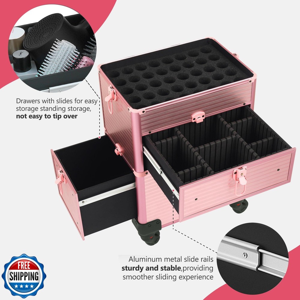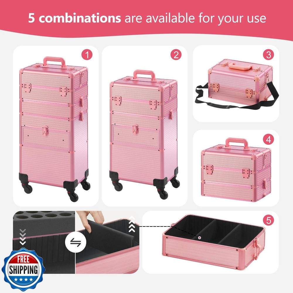 Somduy Rolling Makeup Case with Drawer, Makeup Train Case, 4 in 1Cosmetology Case on Wheels, Christmas Gift, Large Makeup Case Organizers, Profesional Cosmetic Case for Salon Barber, Light pink Features 【Versatile 5-in-1 Makeup Travel Case:】This makeup train case is a true chameleon, offering you the flexibility to customize it to your exact needs. With 4 detachable compartments, you can easily create the perfect setup. Use the top compartment as a portable makeup box, and remove the middle and bottom compartments as needed. 【Drawer Design:】For convenient use, the bottom layer is designed with two drawers, eliminating the need to open and close the tray repeatedly. The middle tray is equipped with nail polish tray, which can be chosen as needed. When removed, it can be used as a separate tray for other items. 【Safety and Portability:】The makeup case organizer is secured with two locks on each layer, ensuring the safety of items with handles on the top. The telescopic handle is adjustable, meeting the needs of individuals of varying heights. The first layer of the case comes with a shoulder strap for separate use. 【Detachable Swivel Wheels:】The wheels can be removed as needed to keep them static. They can rotate 360°and lock 【Multi-scene Use:】 Easy to carry around and save effort, perfect for professional makeup artists, manicurists, hair stylists, beauticians, manicurists, tattoo artists or people who have a mountain of makeup. Shipping Free & Fast Shipping: We offer free shipping to most of the USA with a normal delivery time of 3-7 days. However, due to the current situation, additional delivery time (up to 3 weeks) may be required for some items. Alternative Carriers: We may use alternative carriers (e.g., USPS, FedEx, UPS) to ensure your package arrives safely and on time. Due to the use of multiple carriers, we are unable to provide a tracking number automatically. Handling Time: Orders are processed and shipped within 1-2 business days of receiving cleared payment. Shipping Restrictions: Shipping to Alaska, Hawaii, Puerto Rico, Guam, and other US territories may incur shipping charges or delivery restrictions. Please contact us before ordering, or your order can be refunded/cancelled. State Restrictions: Certain items may not be shipped to California due to state regulations. Contact for Tracking Updates: If you require tracking updates or have any concerns about the delivery of your order, please feel free to contact us, and we will be happy to assist you. Return Policy 30-Day Hassle-Free Returns: If you are not completely satisfied with your purchase, you can return the item for free within 30 days of receiving it for a full refund or exchange. Easy Return Process: Contact us, and we will provide you with a prepaid return shipping label and detailed instructions. No Restocking Fee: There are no restocking fees for returns. However, the buyer is responsible for return shipping costs if the return is not due to a seller"s error. Refund Processing: Refunds will be processed within 1 business day of receiving the returned item in its original condition. Feedback Your feedback is extremely important to us. We strive to provide the best products and customer service possible. If you are satisfied with your purchase, please take a moment to leave us a positive review. If you have any concerns or issues with your order, please contact us before leaving negative feedback. We are committed to resolving any problems and ensuring your satisfaction. Contact Us If you have any questions or concerns, please feel free to reach out to our customer support team. You can contact us through the eBay messaging system. We are available Monday to Friday, 9:00 am to 5:00 pm EST, and we will do our best to respond to your inquiry within 24 hours. Thank you for supporting our small family business!
