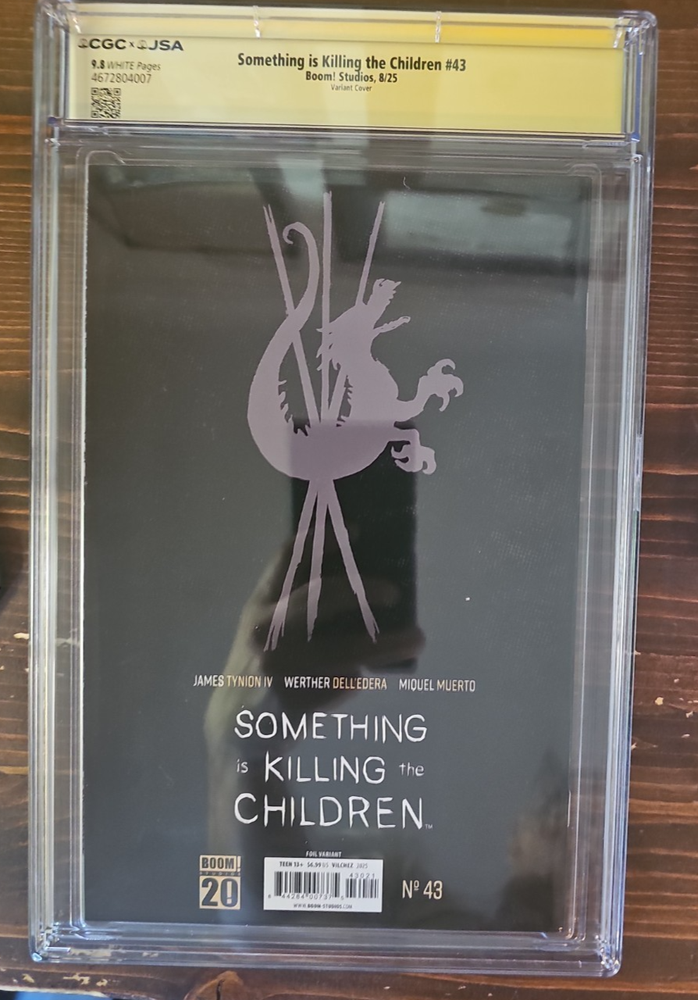 CGC 9.8 White Pages – Signature Series Something Is Killing the Children #43 Boom! Studios (8/25) Foil Variant Cover Signed by: • James Tynion IV • Suspiria This is a CGC x JSA witnessed and authenticated dual-signature slab on a premium foil variant of one of the most collected modern horror titles in comics. SIKTC has a huge collector base and signed 9.8s are extremely scarce, especially with both signatures on the same book. Features: • CGC 9.8 White Pages • Dual signatures • Foil variant cover • Issue #43 • Horror and modern comic