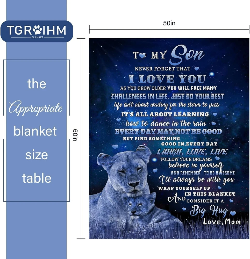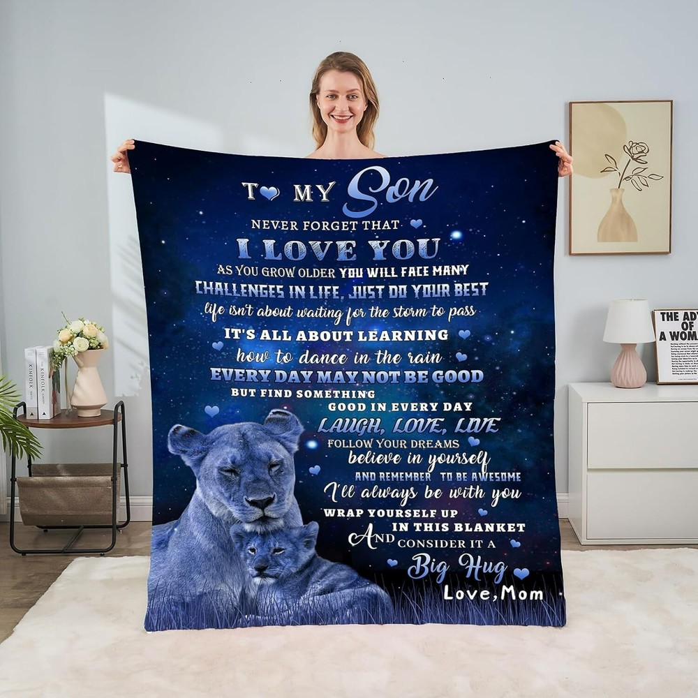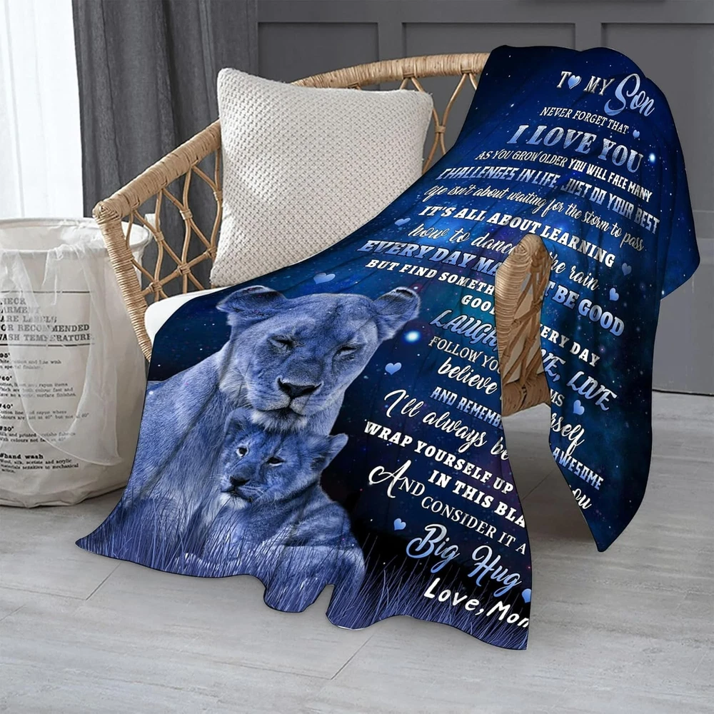 Son Blanket Gift from Mom, Son Lion Blanket 50"x60", Blankets for Son from Mom, Son Blanket from Mom, Son Gifts, Son Birthday Gifts, Fathers Day Valentine Gift for My Son Flannel Throw Blanket Polyester 【Meaningful Son Gifts】The blanket for son design is a timeless piece, it's the ideal way to remind him of the unbreakable bond with their parents. When he encounters life's trials and tribulations and seeks comfort during periods of illness, sadness or depression, this son blanket will provide comfort, provide support and heal - "I love you, Son". Perfect as mom to son gifts, son gifts from mom, son blanket from mom 【Perfect SIZE】60 × 50 Inches(150 × 125cm), perfect size for teens adults, lightweight and foldable, suitable for use in various places, convenient to carry. The unique creative design and soft feeling of the blanket make it an even warmer gift for son. Suitable for use in all seasons and anywhere throughout the , such as a sofa, bed, Living Room or recliner at home, and even outdoor activity use is a good choice. Your son can use it when lounging on a couch for reading or watching TV, or snuggling companion for chilly nights. Also he can also take it outside for traveling, camping, hiking, backpacking and more 【High Quality】Made of anti-pilling flannel, more comfortable and warm, Light weight, and can be folded compactly. Completely resist shrinkage and wrinkles. Our blanket has a velvety fuzzy feeling, soft touch, anti-pilling, anti-wrinkle, anti-allergic, and non-shedding characteristics. With this blanket, you can have a sweet dream at night 【Washing】Machine wash and hand wash, quick-drying, easy to care, do not use bleach 【Son Birthday Gifts】Definitely surprise your son! Soft & Comfy throw blanket with heart warming words makes it a great gift to your son for her Birthday, Fathers Day, Christmas, Halloween, Easter, Thanksgiving, Graduation, Wedding, Valentines Day and other festivals to send your son, to bring him love and blessings. This blanket will keep the happy, memorable, warm and joyful moments with your family and loved ones. Always reminder him - No matter how far you go in life, your blessing will always be with him. Whenever son is at home or going out, this soft warm hug blanket can accompany him anytime Welcome to ! Hope You Can Find Your Favorite Blankets Here. Have Fun!