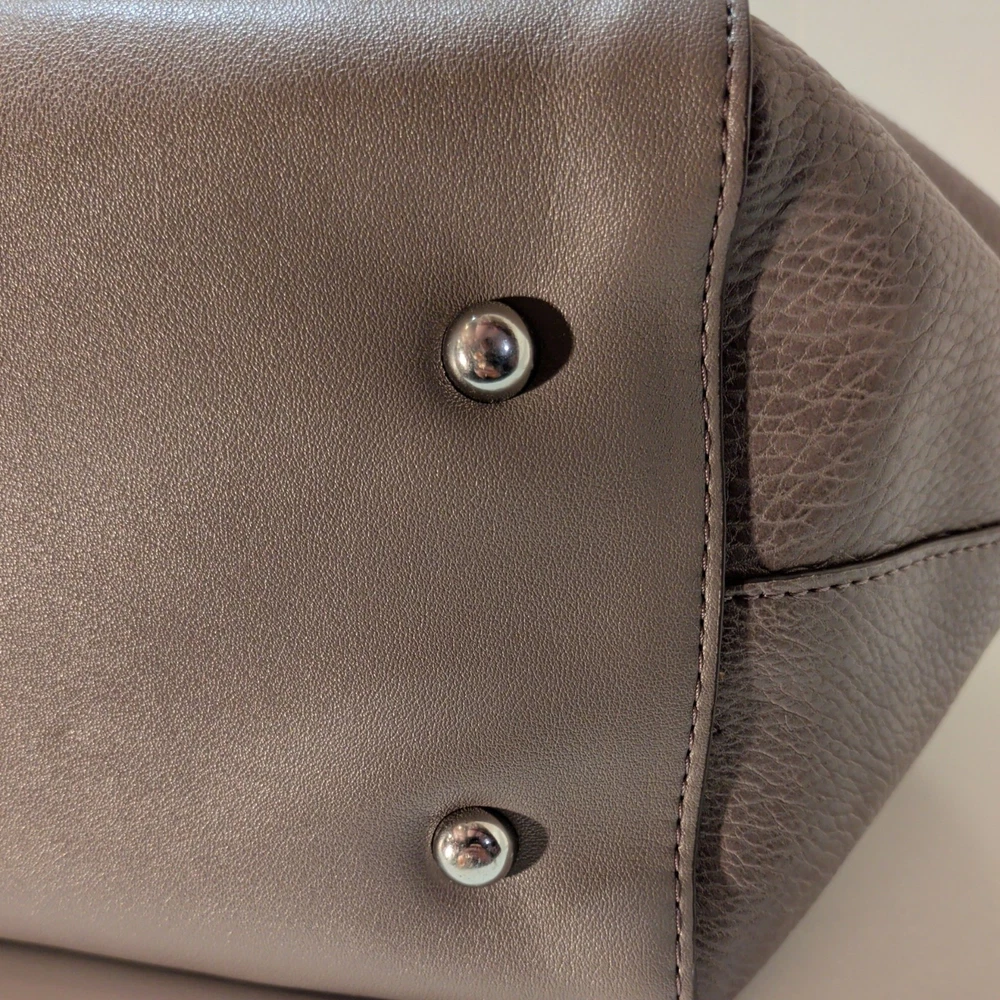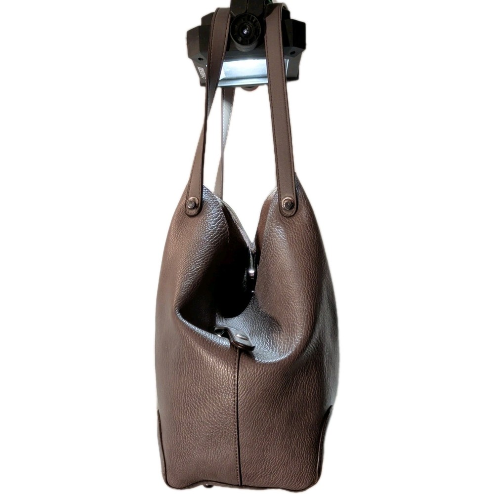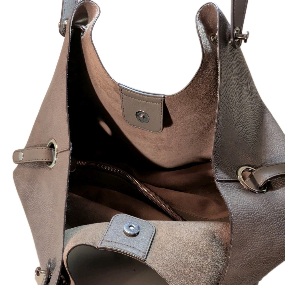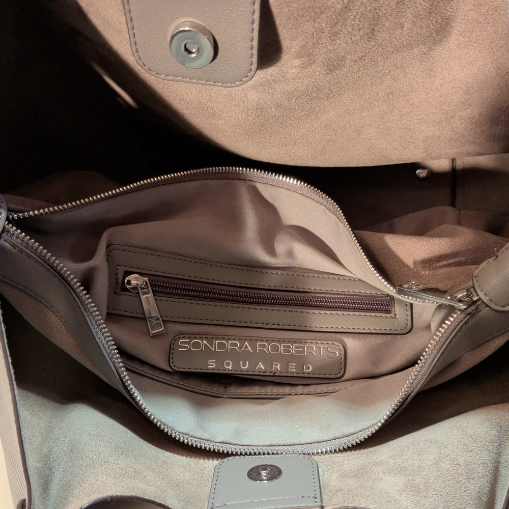The Sondra Roberts Squared Vegan Leather Double Handle Shoulder Bag in Tan Large is a stylish and versatile accessory for women. This square-shaped bag features double handles in gray with silver hardware accents, making it perfect for travel, casual outings, or workwear. The faux leather exterior in tan with a matte finish adds a touch of sophistication, while the soft inner pockets and faux suede lining provide practicality and comfort. Detachable strap and inner pockets add extra functionality to this designer bag from the Sondra Roberts Squared collection.