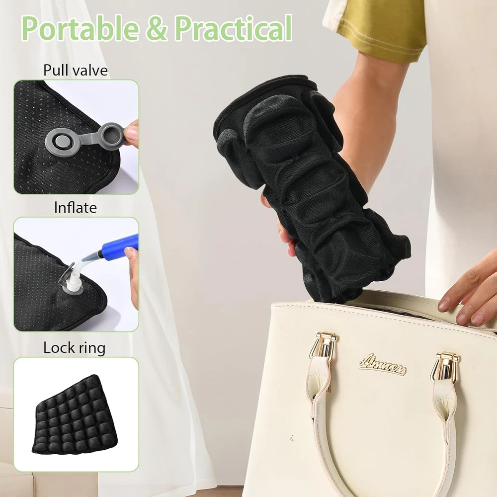 Sondur Travel Cushion Airplane Seat, Portable Inflatable Travel Seat Cushion for Long Flights, Office Chair, Wheelchair, Cars, Home Living, Ergonomic Comfort Support 【Ergonomic Design】: Engineered to address common airplane seat discomfort, this cushion contours to your body's curves. It prevents fatigue during extended periods of sitting, helping you conquer long flights and leave “flight anxiety” behind. 【Lightweight and Portable】: Fits Any Seat Measuring 16.77 inches × 16.77 inches × 1.38 inches, sondur travel cushion fits standard airplane seats, car seats, and office chairs. It easily slips into your carry-on bag, ready for business trips or getaways, ensuring consistent comfort wherever you go. 【Comfort & Pressure Relief】: Experience space-age comfort with our 3D Air Cell Technology system. Independently tested to provide 72% greater pressure relief than memory foam cushions. Hexagonal air chambers simulate zero-gravity support, offering relief for your tailbone during flights exceeding 12 hours. 【Premium Materials & Sandwich Construction】: Durable and hygienic. Crafted from high-quality TPU material, it offers puncture resistance and easy cleaning. The breathable surface prevents sweating, unlike bulky memory foam cushions. 【Universal Anti-Slip Design】: Silicone grips securely anchor to airplane seats, car seats, wheelchairs, and office chairs, ensuring stability even during turbulence or sudden movements. 【Airplane Seat Cushion Customizable Comfort】 After being filled with air, you can press the exhaust valve button to adjust the gas in the seat cushion to a comfortable level. The daily airplane seat cushion can be inflated to 60-70%; the inflation volume is 40-50% during flight to cope with changes in plateau pressure. 【Ergonomic Design】: Engineered to address common airplane seat discomfort, this cushion contours to your body's curves. It prevents fatigue during extended periods of sitting, helping you conquer long flights and leave “flight anxiety” behind. 【Lightweight and Portable】: Fits Any Seat Measuring 16.77 inches × 16.77 inches × 1.38 inches, sondur travel cushion fits standard airplane seats, car seats, and office chairs. It easily slips into your carry-on bag, ready for business trips or getaways, ensuring consistent comfort wherever you go. 【Comfort & Pressure Relief】: Experience space-age comfort with our 3D Air Cell Technology system. Independently tested to provide 72% greater pressure relief than memory foam cushions. Hexagonal air chambers simulate zero-gravity support, offering relief for your tailbone during flights exceeding 12 hours. 【Premium Materials & Sandwich Construction】: Durable and hygienic. Crafted from high-quality TPU material, it offers puncture resistance and easy cleaning. The breathable surface prevents sweating, unlike bulky memory foam cushions. 【Airplane Seat Cushion Customizable Comfort】 After being filled with air, you can press the exhaust valve button to adjust the gas in the seat cushion to a comfortable level. The daily airplane seat cushion can be inflated to 60-70%; the inflation volume is 40-50% during flight to cope with changes in plateau pressure. 8.74 inches x 8.9 inches x 2.99 inches. Weight: 1.04 lb Item model number sondur travel cushion Age Range (Description) Adult Color Black Fabric Type Tpu Item Weight 1.04 pounds Shape Rectangular Use for Buttocks Model Name sondur travel cushion Recommended Uses For Product Driving Fill Material Polyurethane (PU) Special Feature Foldable Package Dimensions 8.9 x 8.74 x 2.99 inches