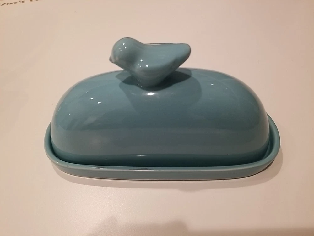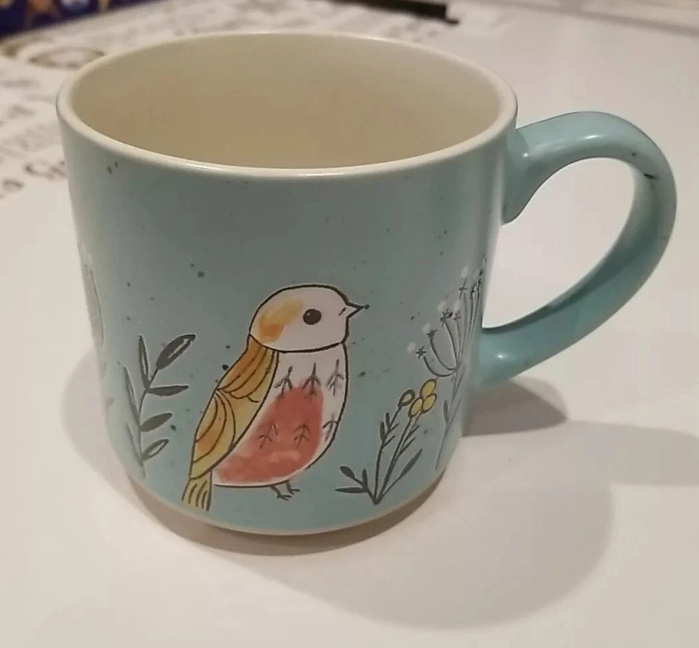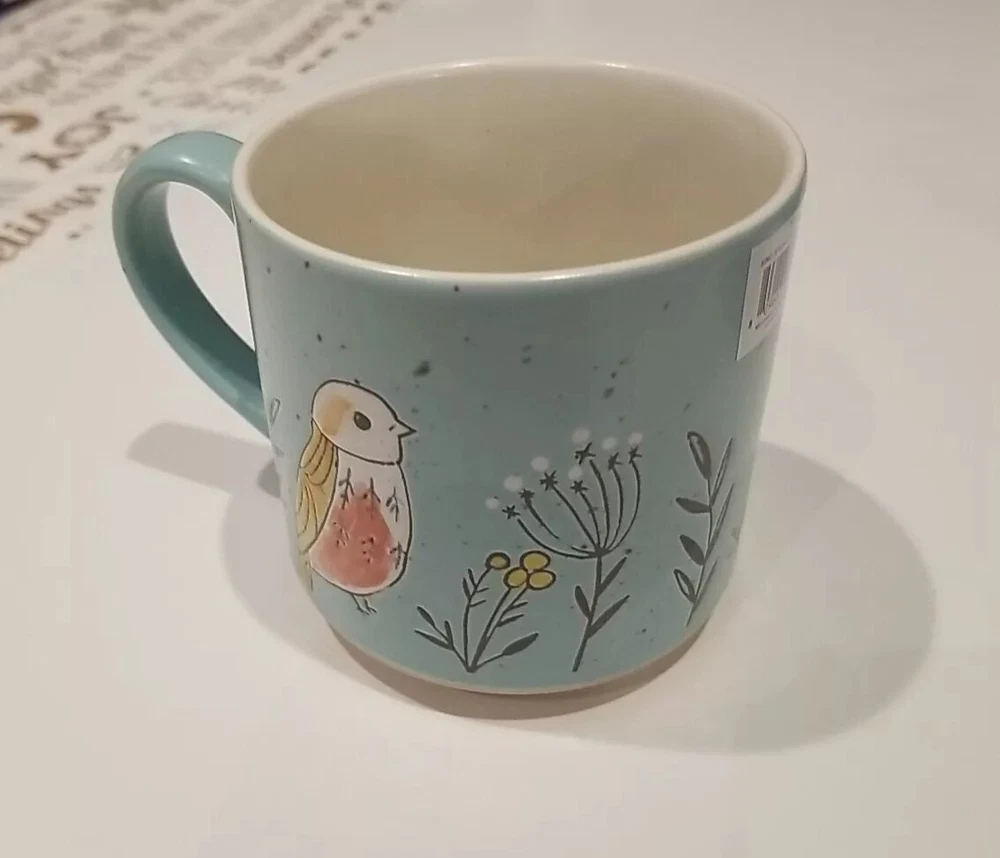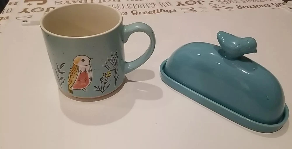 Item 1 of 2 *Spring Song Bird Flower Hand Painted Coffee Mug/Cup. Measures approx 4"H x 4"W, 17 fl oz capacity. Coffee mug from Spectrum Designs Beautiful Blue Embossed, Hand Painted "Sing Spring Bird" Design. Please note bottom brand label has worn off. Item 2 of 2 *Teal Turquoise Porcelain Butter Dish with Bird on Lid 7-3/4 in long World Market. The dish features a charming bird design on the lid . The oval shape and glossy finish of this dish make it a perfect addition to any occasion. Item is preowned and does have some color missing underneath the top please see picture. Sold as a set $33.98 Will mail USPS Ground Advantage