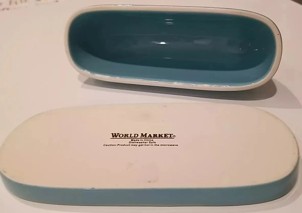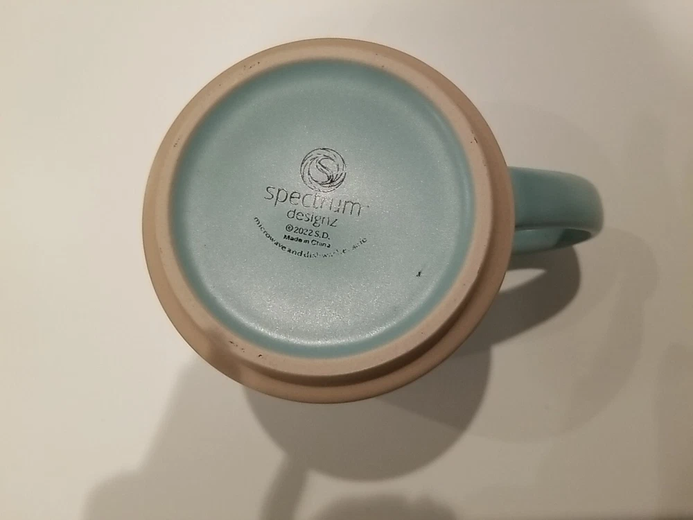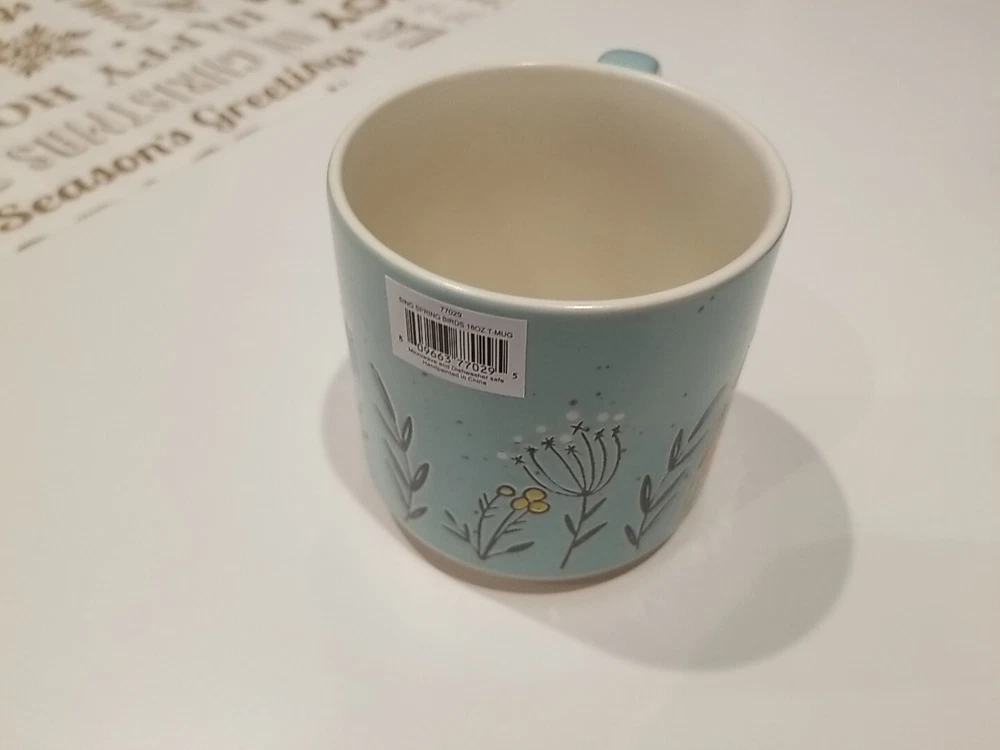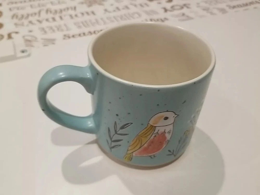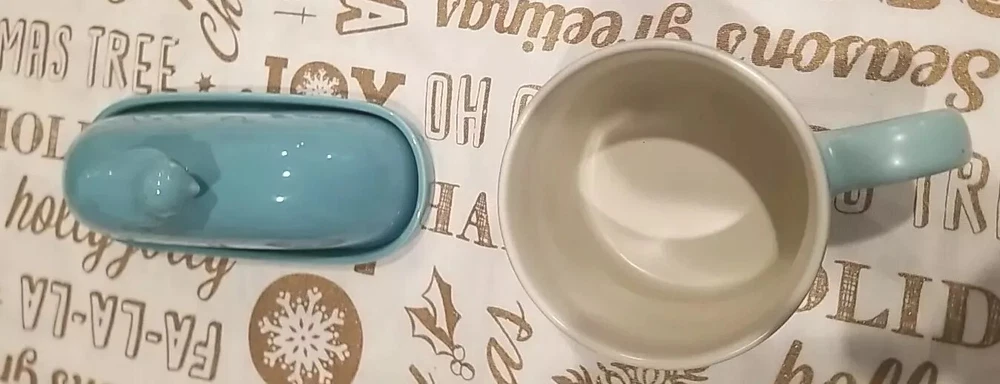 Item 1 of 2 *Spring Song Bird Flower Hand Painted Coffee Mug/Cup. Measures approx 4"H x 4"W, 17 fl oz capacity. Coffee mug from Spectrum Designs Beautiful Blue Embossed, Hand Painted "Sing Spring Bird" Design. Please note bottom brand label has worn off. Item 2 of 2 *Teal Turquoise Porcelain Butter Dish with Bird on Lid 7-3/4 in long World Market. The dish features a charming bird design on the lid . The oval shape and glossy finish of this dish make it a perfect addition to any occasion. Item is preowned and does have some color missing underneath the top please see picture. Sold as a set $33.98 Will mail USPS Ground Advantage