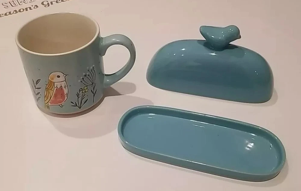 Song Bird Flower Coffee Mug Hand Painted &Teal Blue Butter Dish Bird On Top Of