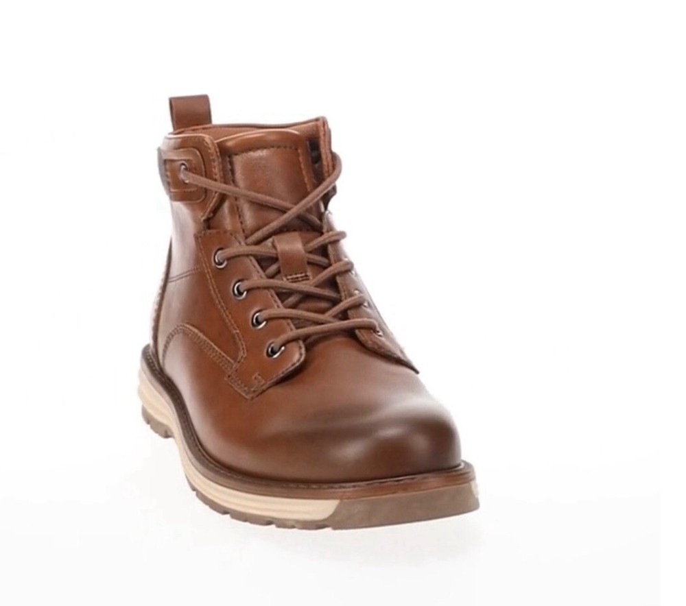 Sonoma Goods For Life Troye Men's Lace-Up Boots in size 9. These boots feature a stylish cognac color and are made of polyurethane material. Perfect for a fashionable and comfortable addition to any men's shoe collection.