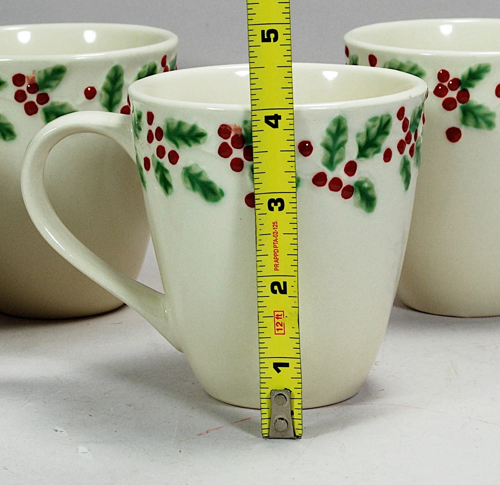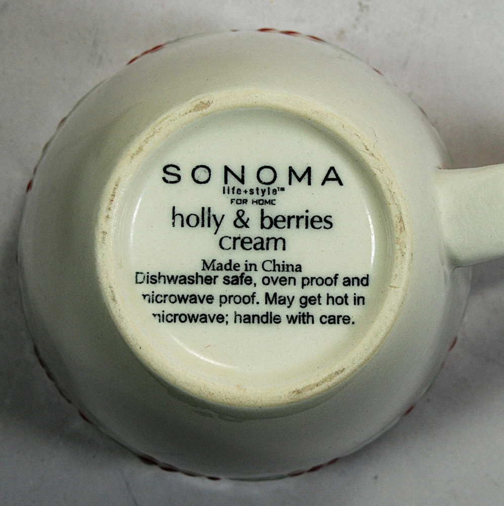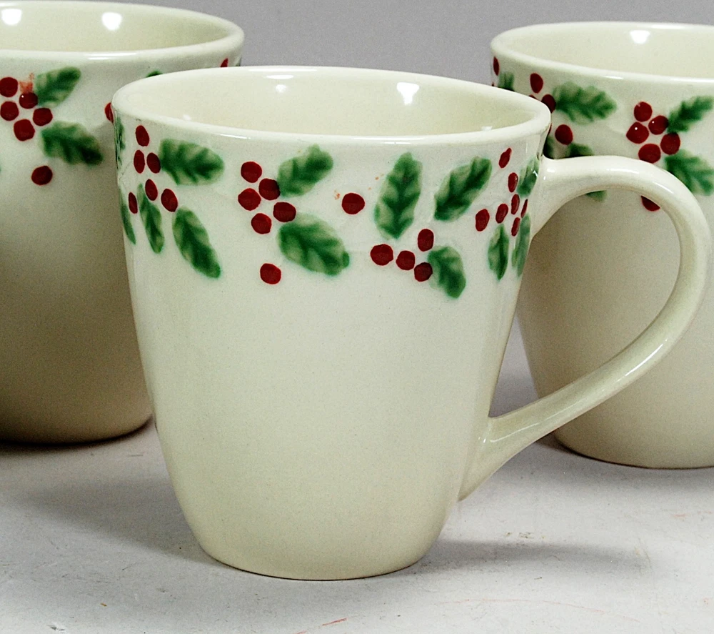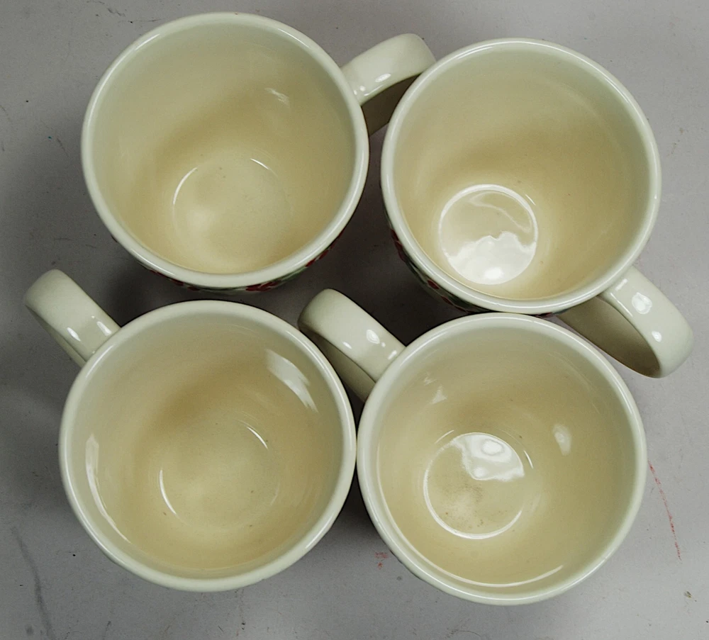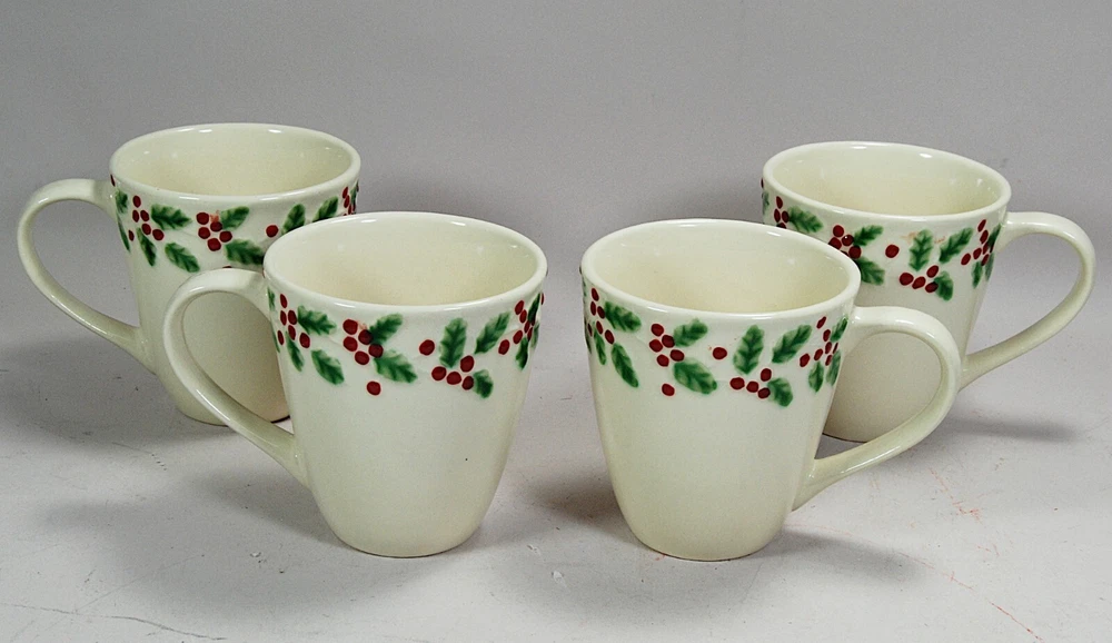 Sonoma Holly & Berries Cream Mugs Set of 4, discontinued pattern. Excellent condition, no cracks or chips, one cup has a slightly dark patch on the inside bottom from the glazing process