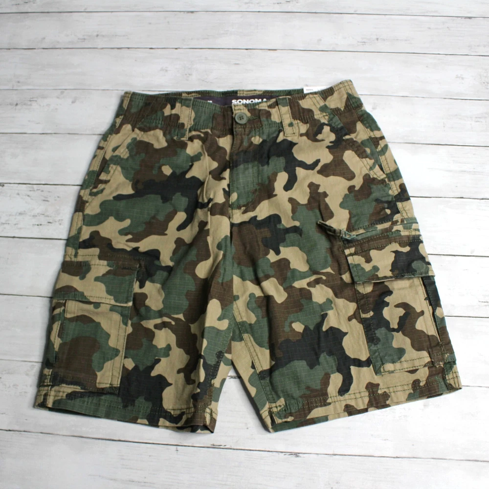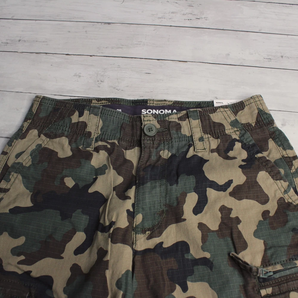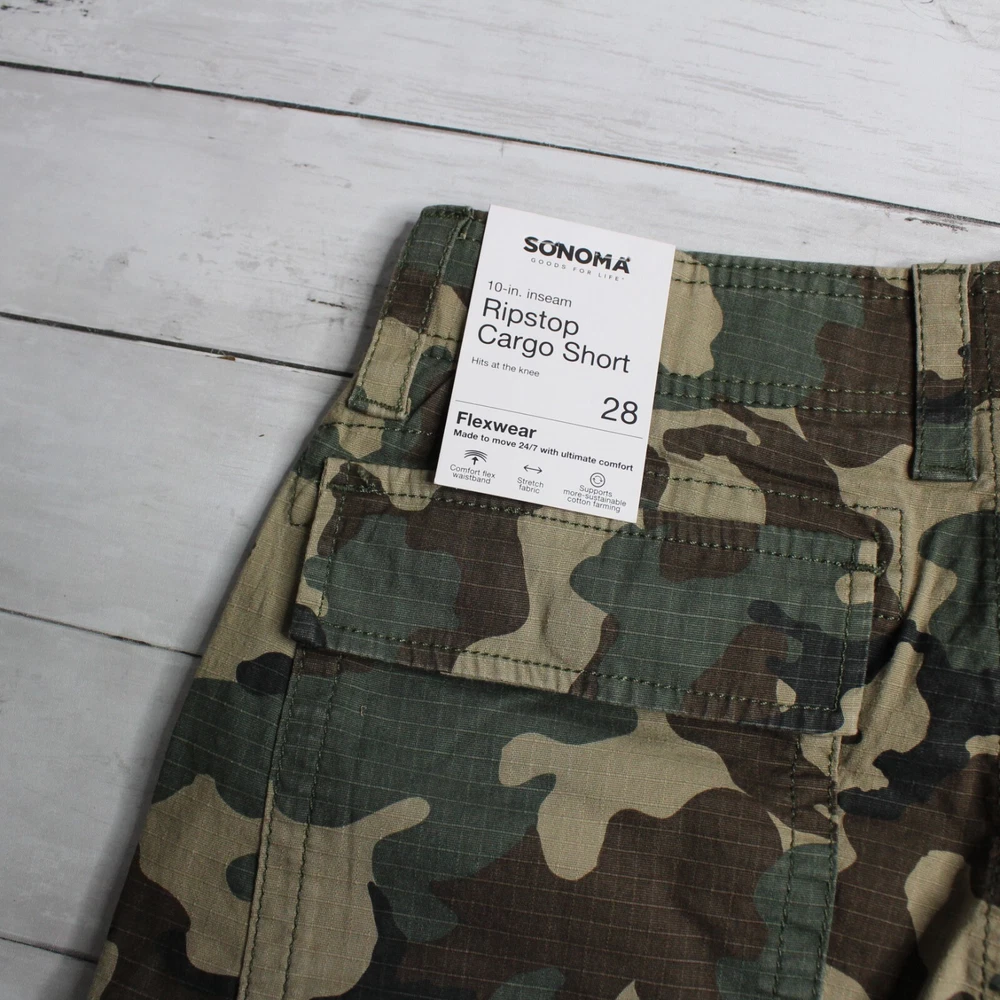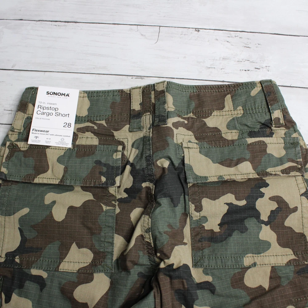 New with Tags Sonoma Casual Ripstop Cargo Shorts Flat Front Hits Above Knee Flexwear Stretch Fabric Approximate 10" Inseam Wide Hidden Elastic Waist with Zipper Front Cargo Pockets 98% Cotton 2% Spandex Colors: Olive Drab, Brown and Khaki Tan Men's Size 28 Retail $40.00 These cargo shorts are really nice quality and are brand new with tags.