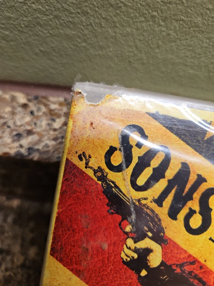 Some of the plastic is coming off but 95% still sealed. Has a missing area on front cover near the top.