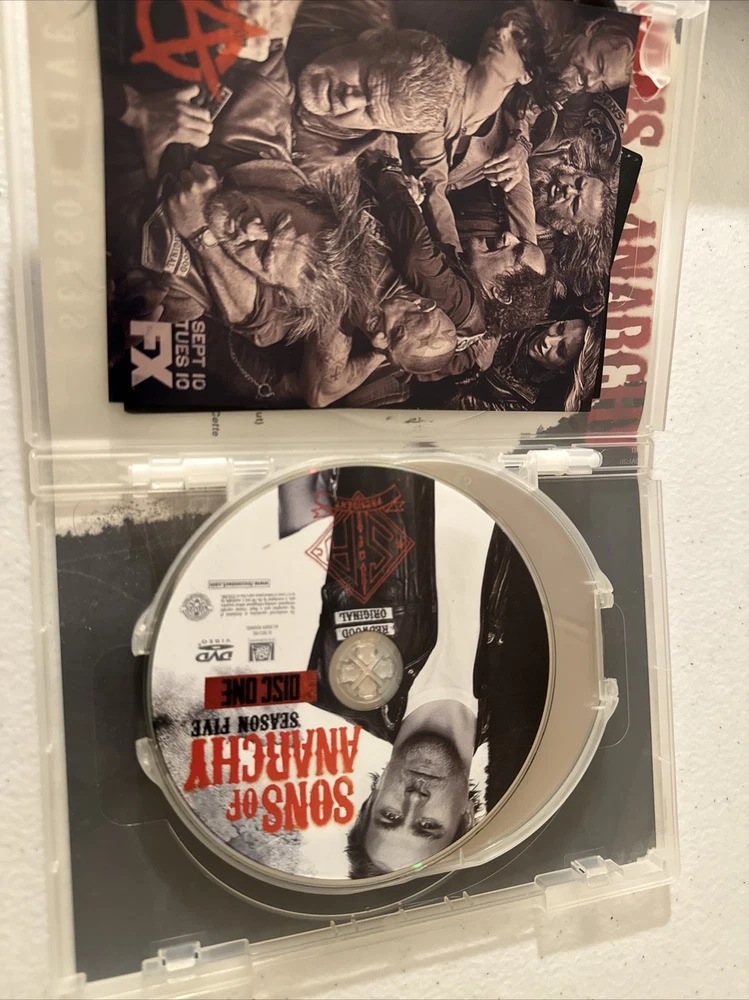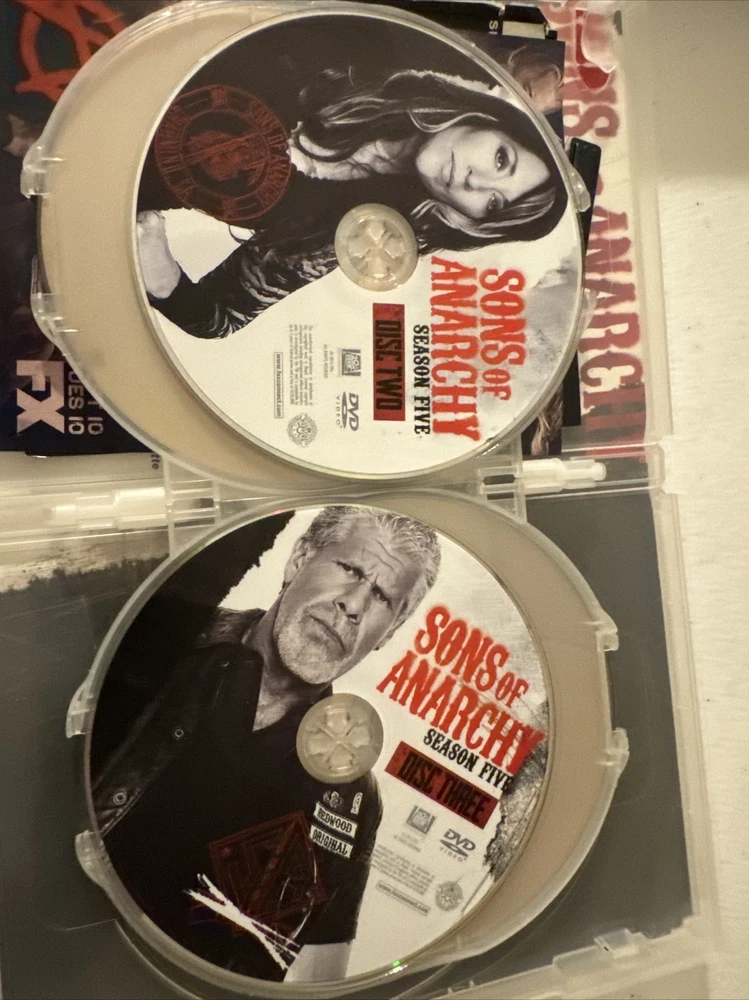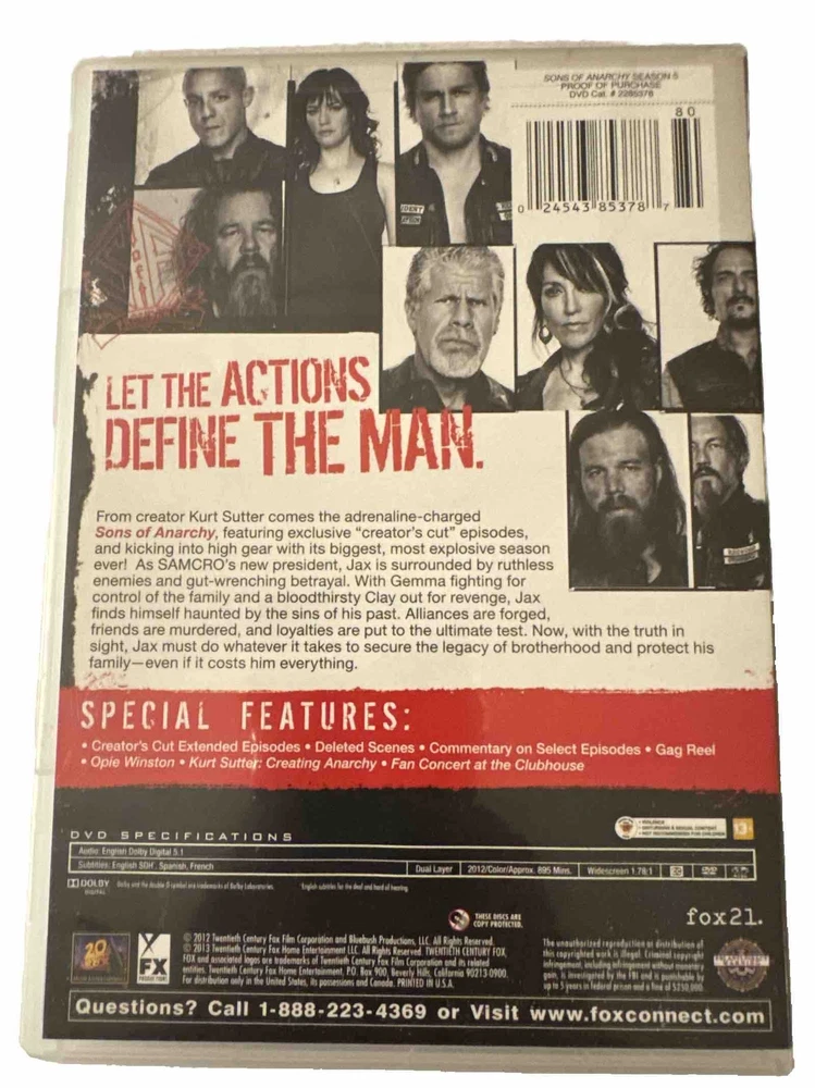 Movie/TV Title: Sons of Anarchy: Season Five Seller Notes: “There are small scratches on the Discs. Case does have scuffs and wear. Tested and no skipping.” UPC: 0024543853787 Format: DVD gtin13: 0024543853787