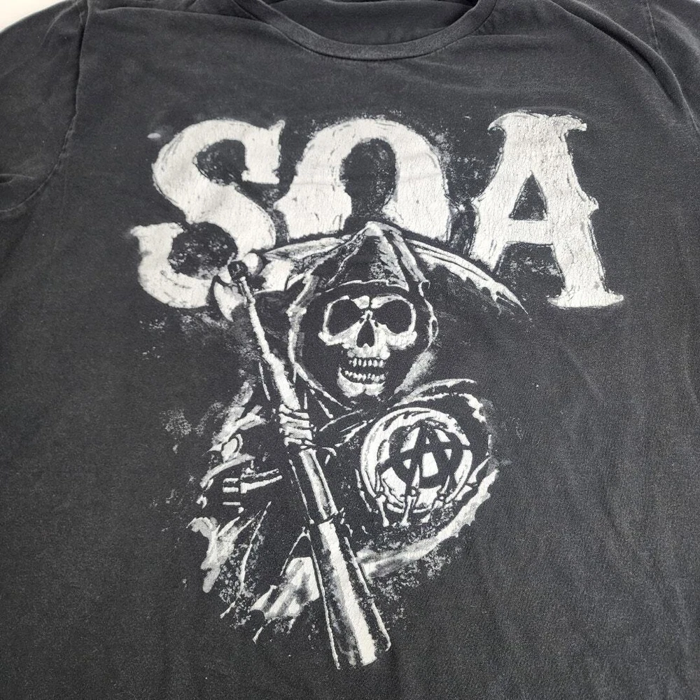 Sons of Anarchy TV Series Black & White Short Sleeve T-Shirt Men's Size 3XL * BRAND: Sons of Anarchy * COLOR: Black / White * SIZE: 4XL * LENGTH: 31" / PTP: 28" * STYLE / MODEL: Sons of Anarchy TV Series Short Sleeve Tee (bleach spots) * MATERIAL: Cotton / Polyester Pre-Owned / Used: A product that has been used previously. View our listing for full details in our description and check out our photos provided. If there are any imperfections, it will be noted in the description and/or within the provided photos. We appreciate you looking at our listing. Before placing an order, feel free to ask any questions you may have about this item. Upon receiving your order, if you are not satisfied with your order, please contact us and we will address any issue.