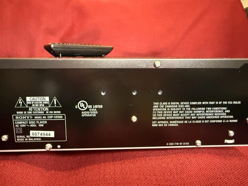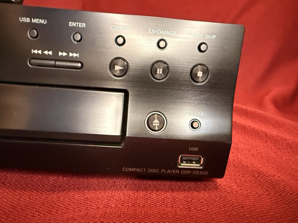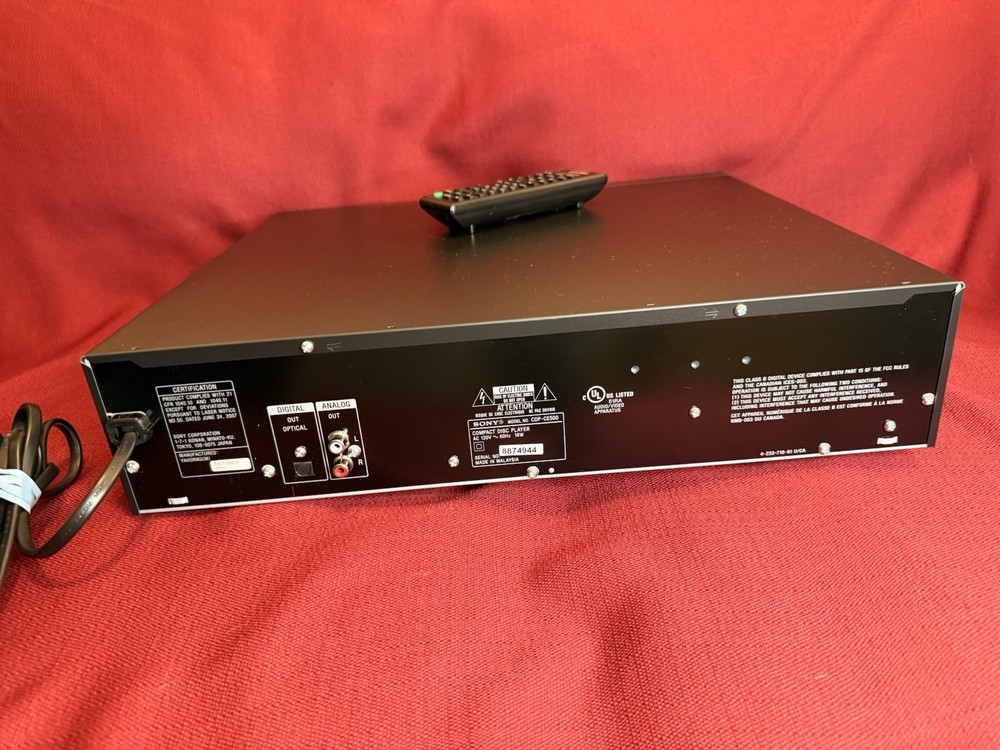 The Sony CDP-CE500 Multi CD Player is a reliable and high-quality home audio component perfect for music enthusiasts. With a 5 disc changer capacity, it allows for convenient playback of multiple CD's. The player also features a headphone jack for personal listening and the ability to record on CD-R and CD-RW discs. With both digital optical TOSLINK and headphone jack audio outputs, this CD player provides versatile and clear audio playback options. Whether you're looking to enjoy your favorite CDs or record your own, the Sony CDP-CE500 is a versatile and dependable choice.