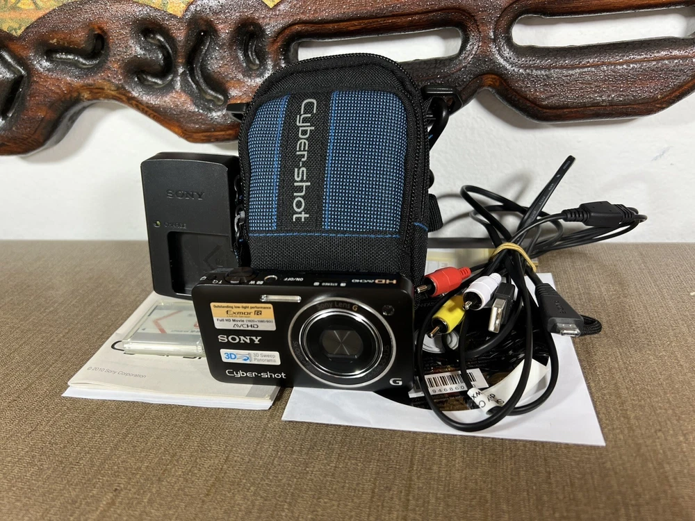 Sony Cyber-Shot DSC-WX5 12.2 Megapixel 5x Optical Zoom Black Digital Camera with carrying case, manual, CD software, charger, two batteries, & AV USB cable. Tested & working. Preowned used condition - some damage to top left corner & splitting on top (doesn’t affect camera) - please use photos for references. Order will be shipped via USPS. Please message any questions or concerns.