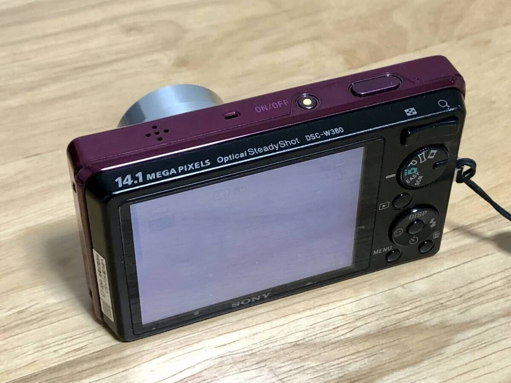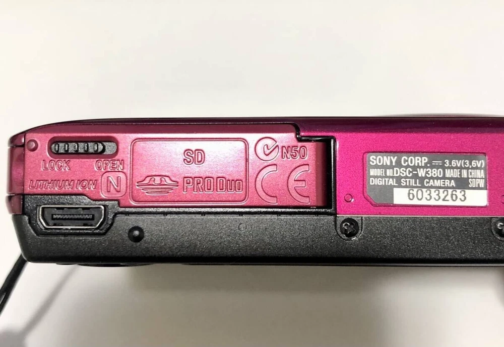 Sony Cyber-shot DSC-W380 14.1 MP Pink Digital Camera - 90%NEW Product Description: The DSC-W380 is a 14.1 megapixel camera with a useful f/2.4-5.9, 26-104mm equiv. zoom lens and a 2.7" screen.You get an interesting blend of features inlcuding, a Sweep Panorama mode, in-camera editing features and standard HD video recording. Body type Ultracompact Max resolution 4320 x 3240 Effective pixels 14 megapixels Sensor size 1/2.3" (6.17 x 4.55 mm) Sensor type CCD ISO Auto, 80, 100, 200, 400, 800, 1600, 3200 Focal length (equiv.) 24–120 mm Max aperture F2.4–5.9 Articulated LCD Fixed Screen size 2.7″ Screen dots 230,400 Max shutter speed 1/1600 sec Format Motion JPEG Storage types SD/SDHC, Memory Stick Duo / Pro Duo / Pro HG-Duo, Internal USB USB 2.0 (480 Mbit/sec) Weight (inc. batteries) 117 g (0.26 lb / 4.13 oz) Dimensions 91 x 52 x 20 mm (3.58 x 2.05 x 0.79″) Package included: Camera Battery Charger SD Card On Jan 9, 2025 at 04:48:12 PST, seller added the following information: