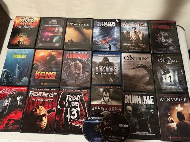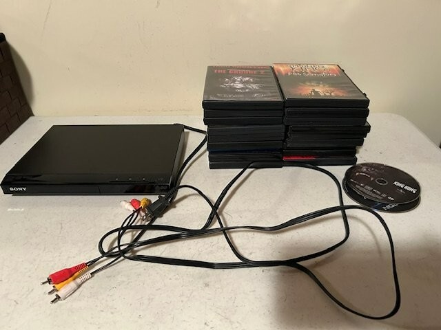 Here is a sony dvd player that works good and a lot of 20 dvd movies mostly horror movies or thrillers and 18 of them are in original cases as you see and 2 are without case, all work good and most only used 1 or 2 times, getting a good lot of movies if you like horror movies or thrillers, only had for when my grandson came to stay who liked horror movies, and the dvd player works good and cables with it ready to hook up and have a movie day, I live in clean and smoke free home. AND SELLING AS LOT ONLY WILL NOT BREAK UP.