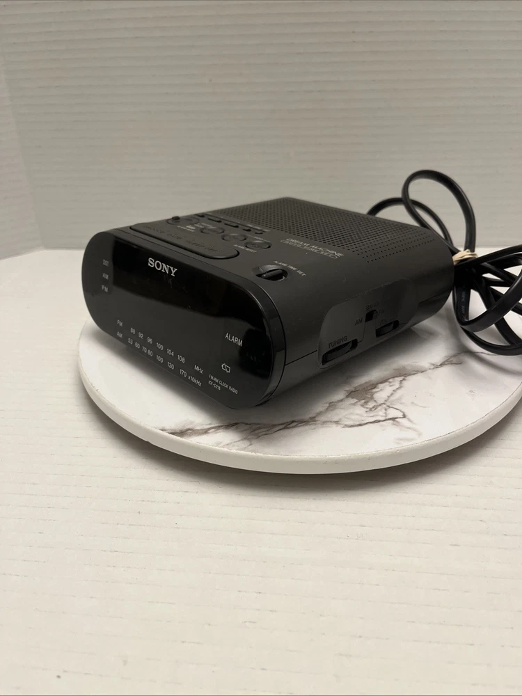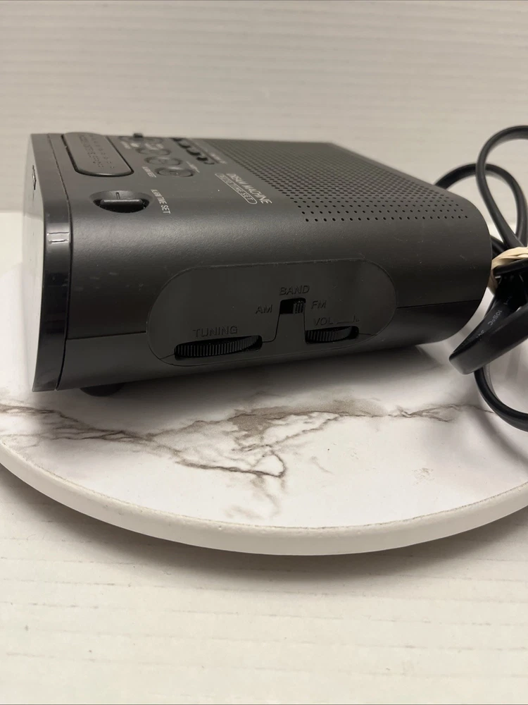 This Sony Dream Machine ICF-C218 alarm clock radio is a great addition to any room in your home. With its modern black finish and square shape, it is both stylish and functional. The clock is powered by an electrical source and features an LCD display, which makes it easy to read the time and other important information. In addition to being an alarm clock, this device also has AM/FM radio capabilities, so you can listen to your favorite radio stations while you get ready for your day. It also has a snooze function, battery backup, and 12 hour display. The clock is made of plastic and is an original item, not a reproduction. It is perfect for use in the bedroom, home office, study, dining room, kitchen, or garage.