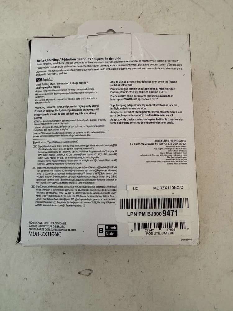 Sony MDR-ZX110NC On-Ear Headphones Black Wired Noise Canceling Foldable Headband Description Sony MDR-ZX110NC On-Ear Headphones Black Wired Noise Canceling Foldable Headband . Product Detail • Brand : Sony • Model : Sony MDR-ZX110NC • Color: Black • Type : Headphones Please message me if you have any questions.