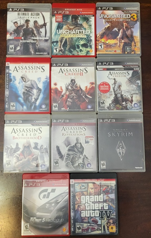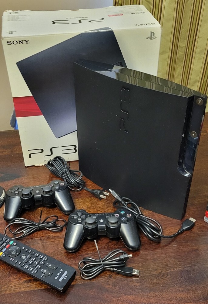 Used Playstation 3 with 13 games, PS3 remote, and energizer charging station. All controllers and system have been tested and work. Please note that while controllers charge and work wirelessly, battery longevity may be diminished due to age of the system. Parts list: PS3 Console 2 Dualshock controllers 2 Controller charging cables HDMI cable Power cable Energizer Charging station PS3 Controller Games: Tombraider Sleeping Dogs Just Cause 2 Uncharted: Drake's Fortune Uncharted 3: Drake's Deception Assassin's Creed Assassin's Creed II Assassin's Creed III Assassin's Creed Brotherhood Assassin's Creed Revelations Skyrim Gran Turismo 5 Prologue Grand Theft Auto IV