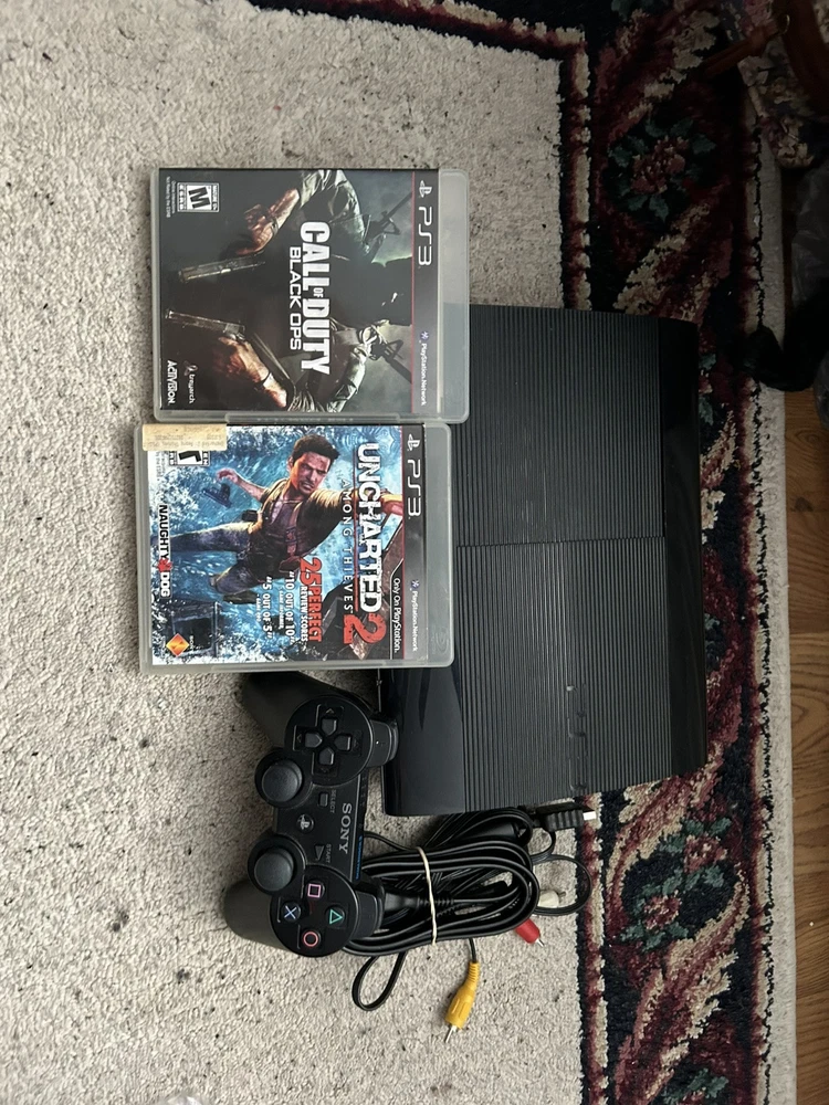 Sony PlayStation 3 PS3 Super Slim Black Console With Controllers, Cords, 2 Games. Condition is Used. Shipped with USPS Priority Mail.