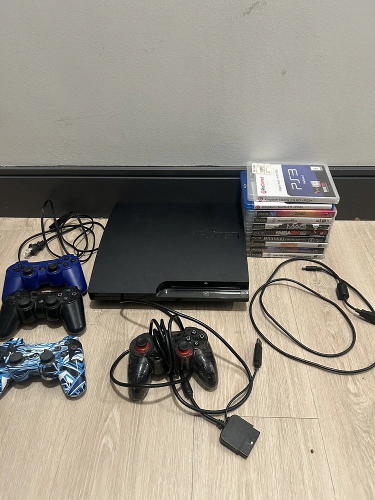 PS3 Slim 250 GB CECH-2001B. System is tested and works great. Comes with 4 controllers. 1 actual Sony PS3 controller and 3 3rd party ones. From my memory, the controllers don’t work great but they still function. Some stick drift on them. Also comes with 10 games and includes titles like Madden, NBA 2K, FIFA and Kingdom Hearts. Great system and lots of hours can be spent on it. Has a power cord but does not come with an HDMI cord. If you have any questions or need additional photos, please let me know!