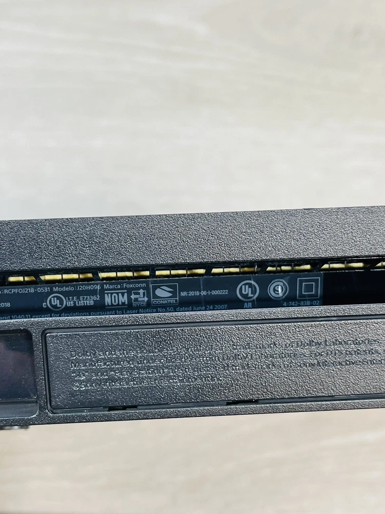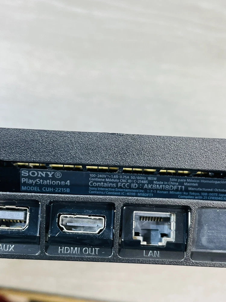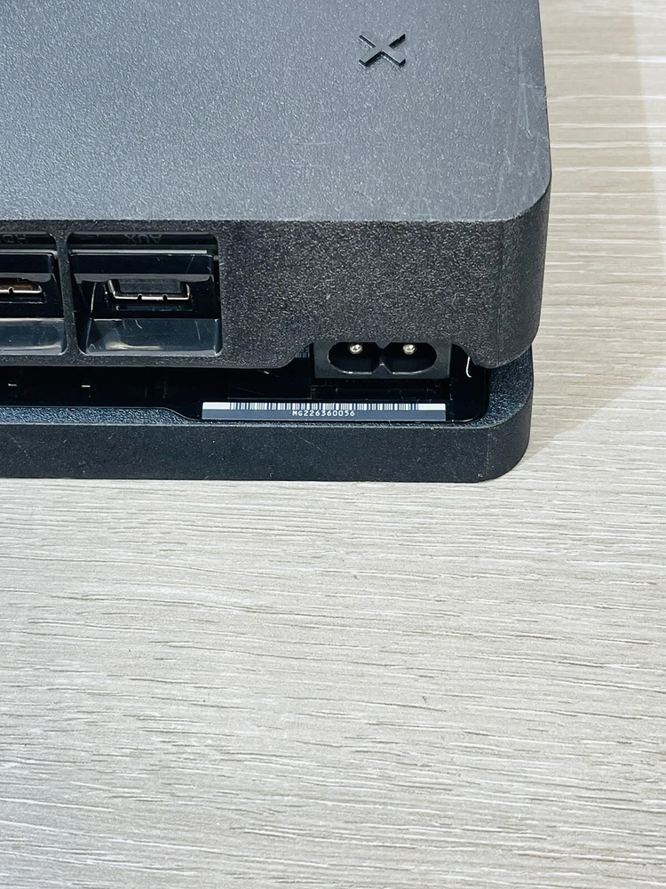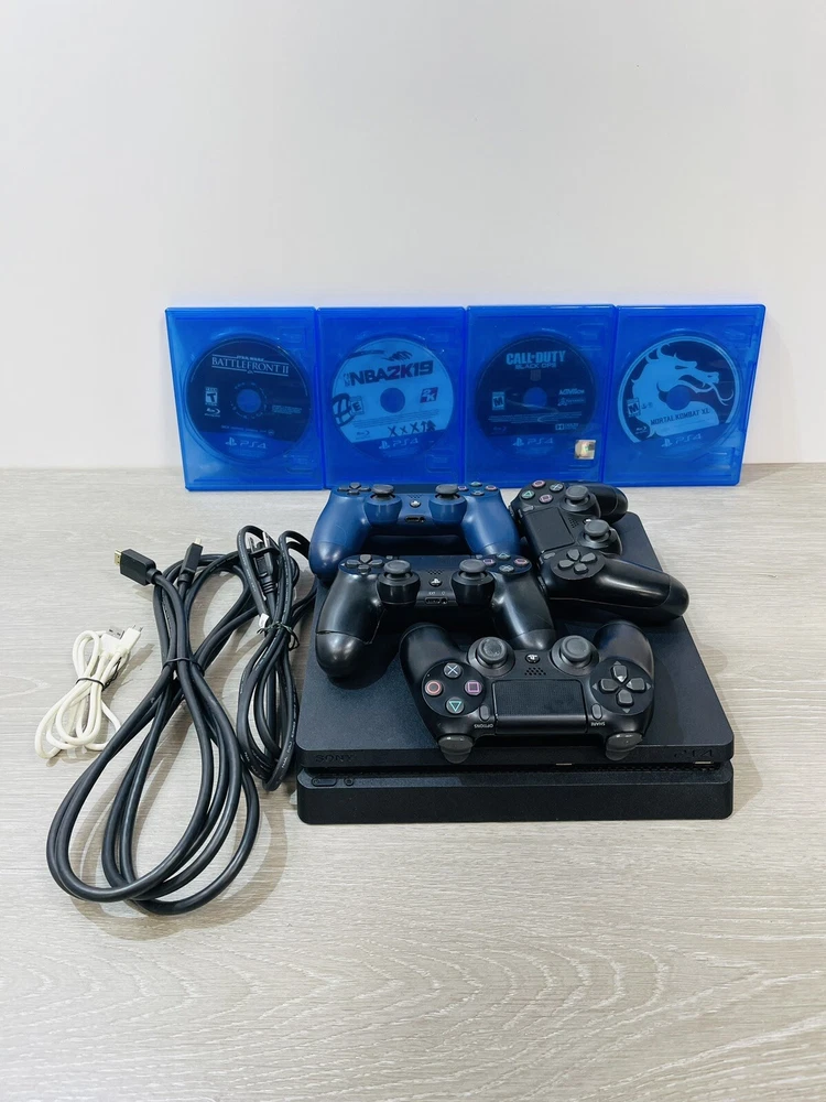 In good working condition, the PS4 slim has been upgraded to one terabyte , All four controllers hold a charge and work , One does have a lifted cover . There is minor wear present to the system and controllers .