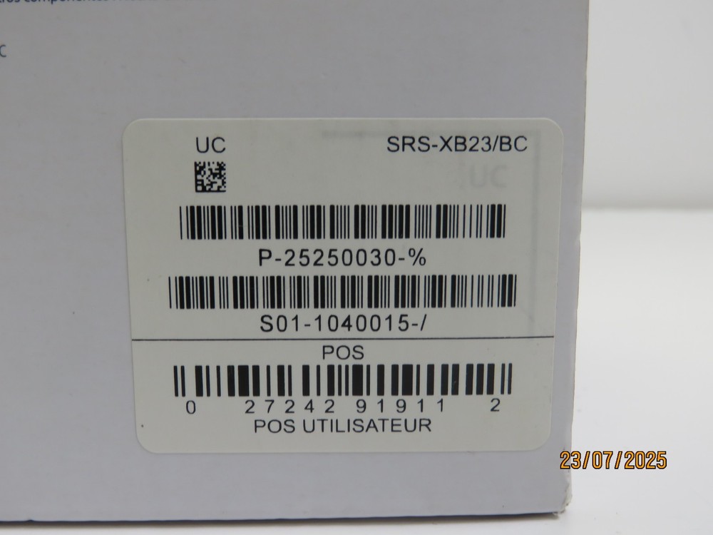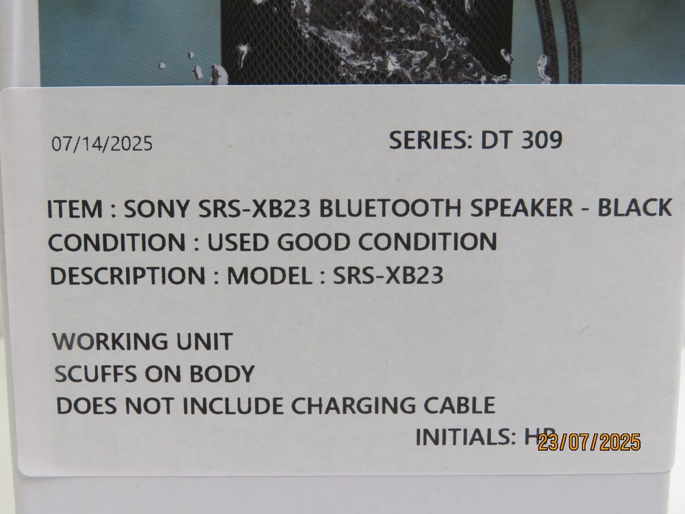 Sony SRS-XB23 Bluetooth Wireless Speaker - Black [DT309] Functional Condition: Tested and Functional. Cosmetic Condition: This is a Used Item and Normal Wear (Scuffs & Scratches) is Expected. Scuffs on body. Items included in this listing: Bluetooth Speaker Items NOT included in this listing: Charging Cable Thank you for Shopping with Us! ENJOY Free Shipping in USA & Low Cost Shipping to CANADA! Terms of Sale NOTE: Our Listings only include items as pictured - Please do not assume any item is included if its not pictured. We will try our best to picture all items included in this listing as well as its cosmetic condition. We Guarantee & Stand Behind our product and commitment to provide you with o nly Original, Branded, OEM & Genuine Products Shipping A complete and correct shipping address is essential. We cannot guarantee the shipping address can be changed after checkout. Sales Tax will be charged to all Canadian & USA Buyers. Combined shipping is not guaranteed. We are unable to change any content of your order based on the eBay checkout note or PayPal message. Customers with shipping addresses outside of the U.S.A and Canada are responsible for all duties and import taxes. Please contact your customs for information Bidding All items are accurately described and pictured. Please ensure you are consciously bidding on the items as described. Payment Payments are expected at the time of purchase or in case of Auctions, at the end of auctions. Payments are managed via eBay Managed Payments Contact Us Your positive feedbacks are extremely valuable to us. If you have any concerns about your order, please contact us through eBay message to resolve any issues before leaving a negative feedback or opening a dispute. We will reply within 24 Hours Return Policy All items are in used condition unless specified.