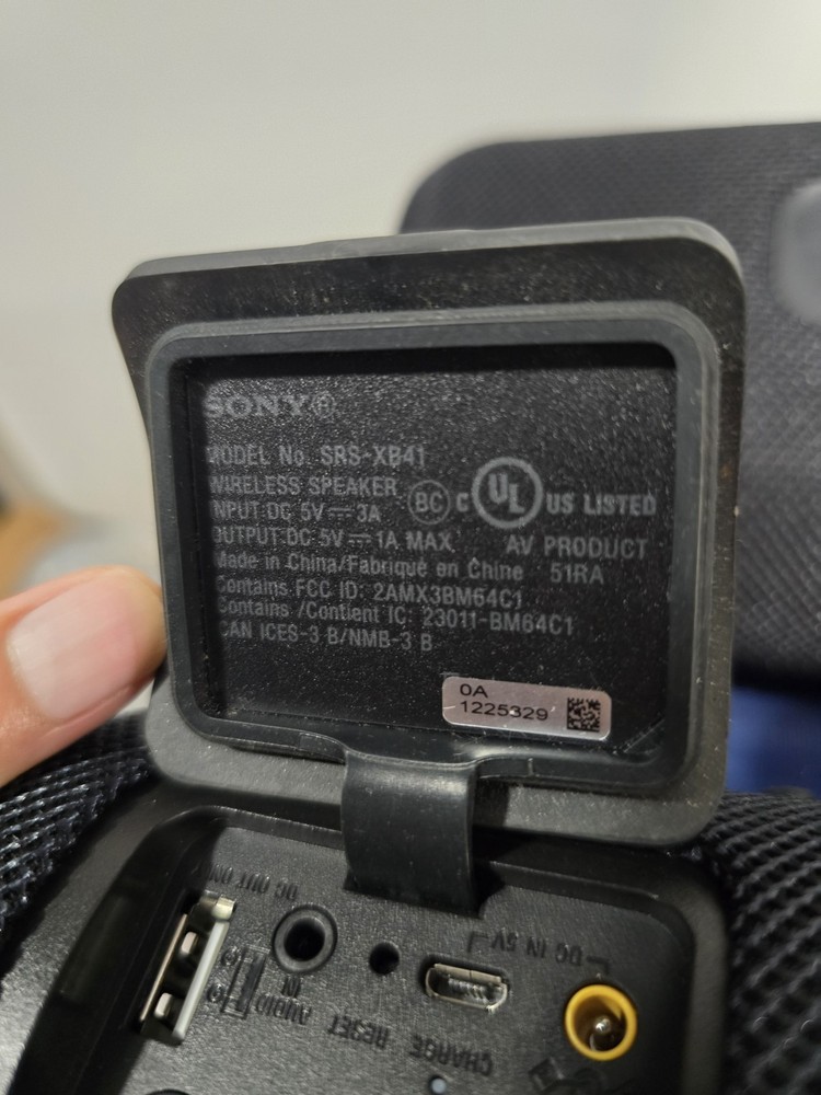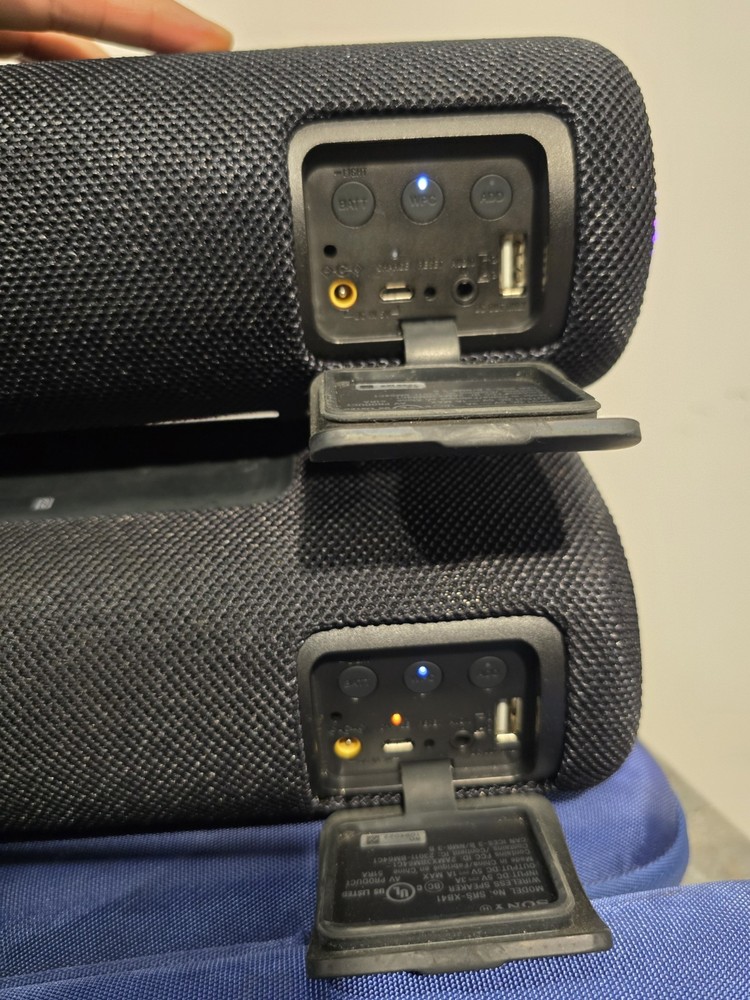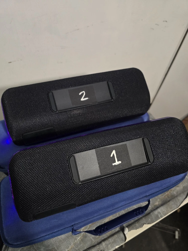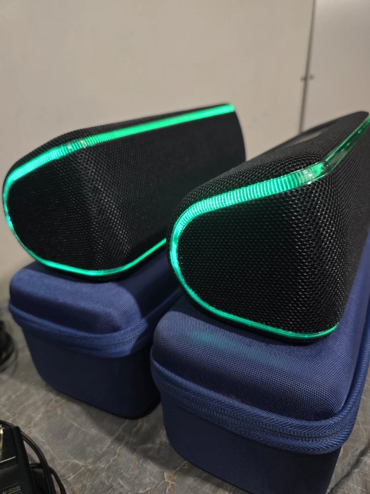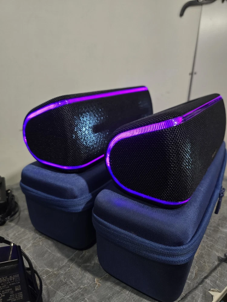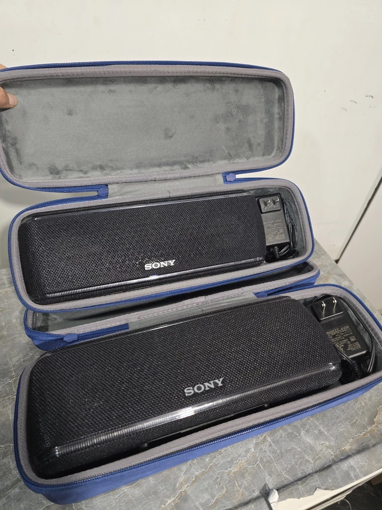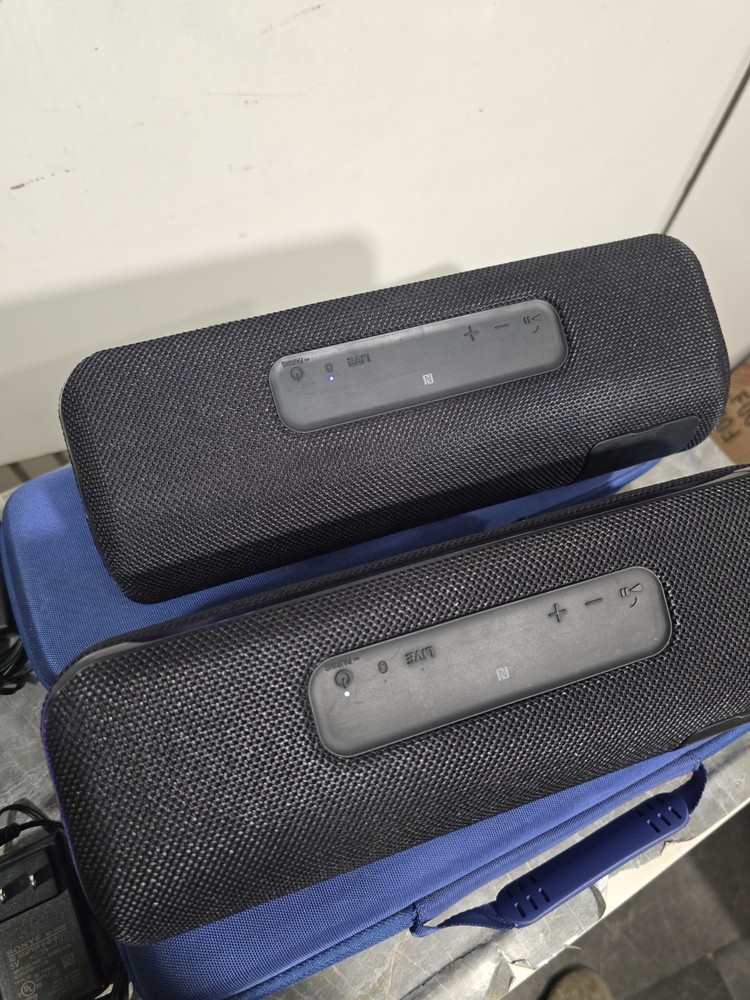 Used good condition Set of 2 Sony SRS-XB41 Black Portable bluetooth speakers. Had them since new. Battery life is still good. Never had any issues or problems with the speakers. No scratches or damages. Comes with original charger and blue carrying case. Has gaffers tape numbered 1 & 2 on the bottom of each. It's removable, but I'm leaving it as it makes it easier to identify each speaker. No box, no manual Ships with usps.