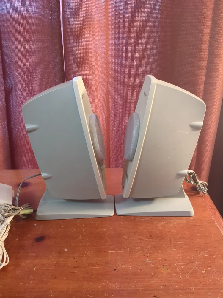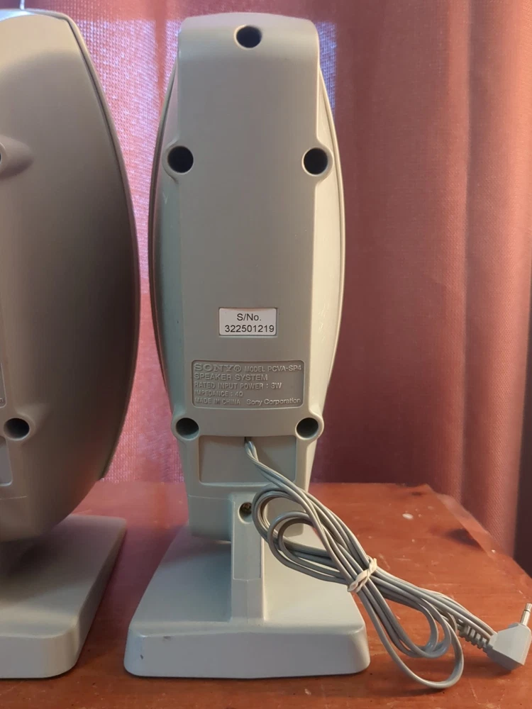 TESTED AND WORKING NEITHER SPEAKER IS BLOWN A/C ADAPTER INCLUDED 11 INCHES TALL SHIPPED WITH CARE Sony Vaio PCVA-SP4 Speakers are a wired set designed for desktop computers. The speakers include a left and right speaker unit along with an A/C adapter for power. Perfect for enhancing audio output on your Sony desktop computer.