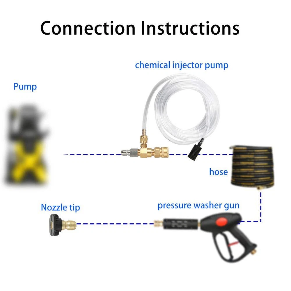 ✯Good Customer Service✯: Any quality or use problem,feel free to contact with us. The professional service team is always here for you. ★Specification: -Rated PSI: 2000-4000 PSI -Min GPM: 2 -Max GPM: 5 -3/8 inch quick disconnect fitting. ★Package Includes: -1 x Chemical Injector -1 x Siphon hose, 16 feet -1 x Filter -1 x 3/8 inch female snap coupler -1 x 3/8 inch male snap coupler -1 x 1/4 inch Black soap nozzle -2 x Teflon Tapes ★Application: -Used to draw the detergent out of a separate container. Running chemicals or soap after the pump will not damage the pump. Ideal for cleaning or spraying. ★Features: -Solid construction-Made of brass and stainless steel , the downstream injector is heavy duty to last a long time. -The soap dispenser kit is equipped with a screw-in valve that adjusts the dilution ratio and increases the efficiency of the pressure washer. -Our products are marked with flow arrows, pay attention to the flow arrows on the injector, and do not install them backwards. -16ft siphon hose with filter into the chemical container, allowing you to use a variety of chemicals without damaging your pump. ★Warnning: Do not point at face or other persons, and do not use close to surface. ❤【Premium Quality】Made of tough brass and stainless steel,resistant to corrosion and fading. ❤【Instructioin Manual】The maximum pressure is 4000 PSI. Flow arrows Marks on the injector and do not install it backwards. ❤【Kit Package】The chemical injector kit includes chemical injector, 16 feet tubing (siphon hose), filter and 1/4 inch quick connect black soap nozzle which connect to your gun or wand. ❤【Scientific Design】The soap dispenser kit is equipped with a screw-in valve that adjusts the dilution ratio of chemicals and water to increase the efficiency of your high pressure washers. ❤【Quality Assurance】Any problem,feel free to contact us.The professional team is always ready to serve you.