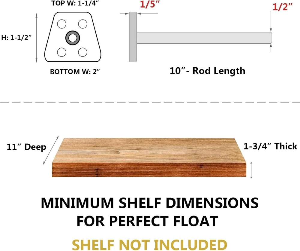 About this item Rod Length: 10” | Diameter: 1/2”, Backplate Width:2” | Tall: 1-1/2”. Perfect for shelves 11"-14" deep and 1 -3/4 to 2-1/2 inch thick ACCURACY- Precision laser-welded and a custom-made Dowel Jig makes it easy to get a hidden shelf with perfect leveling TOUGH- Constructed of rugged solid carbon steel with an industrial-grade powder coating that is anti-rust and chip-free LARGE CAPACITY- 150 lbs. max weight capacity per pair when all four holes are mounted into standard American 2x4 Studs EASY TO INSTALL- Screws, anchors, and a dowel jig include. Also comes with easy-to-follow detailed instructions that guide you step by step in the installation process