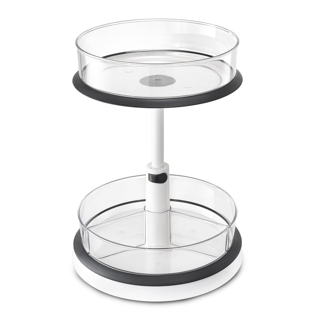 Maximize your kitchen storage with the Sorbus 2-Tier Lazy Susan Organizer. This innovative turntable is designed to revolutionize your pantry, cabinet, or countertop organization. Featuring a clear, spacious design, it offers unparalleled visibility of your items, allowing you to quickly locate what you need. Engineered with stability in mind, the bottom silicone pad smooth rotation and prevents the organizer from shifting. Both the upper and lower trays are independently rotatable, providing effortless access to your essentials while elevated edges safeguard against accidental spills or drops. For added versatility, each tray can be used separately, adapting to your changing storage needs. Whether you're organizing spices, canned goods, or other kitchen items, this 11-inch white lazy susan is the perfect solution to declutter your space and enhance efficiency. Its durable construction and easy-to-clean surface make it a practical and stylish addition to any kitchen Provides a practical solution for optimizing kitchen storage space Dual-tier design with independently rotating trays offers efficient access to frequently used items clear visibility of stored items, minimizing time spent searching for specific products Adaptable to various storage needs Each tray can be used individually or together, providing flexibility for different kitchen layouts and item sizes Non-slip base and elevated tray edges combine to prevent accidental spills and secure placement on countertops or shelves Constructed from durable materials Easy to clean and maintain, preserving its appearance over time Measures 14.68"L X 11.29"W X 11.29"D