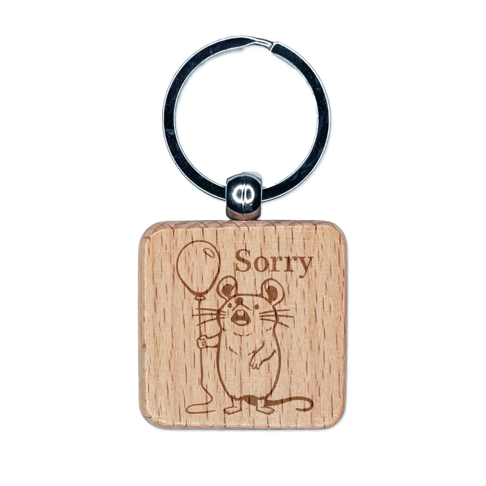 Sorry Mouse with Balloon Engraved Wood Square Keychain Tag Charm