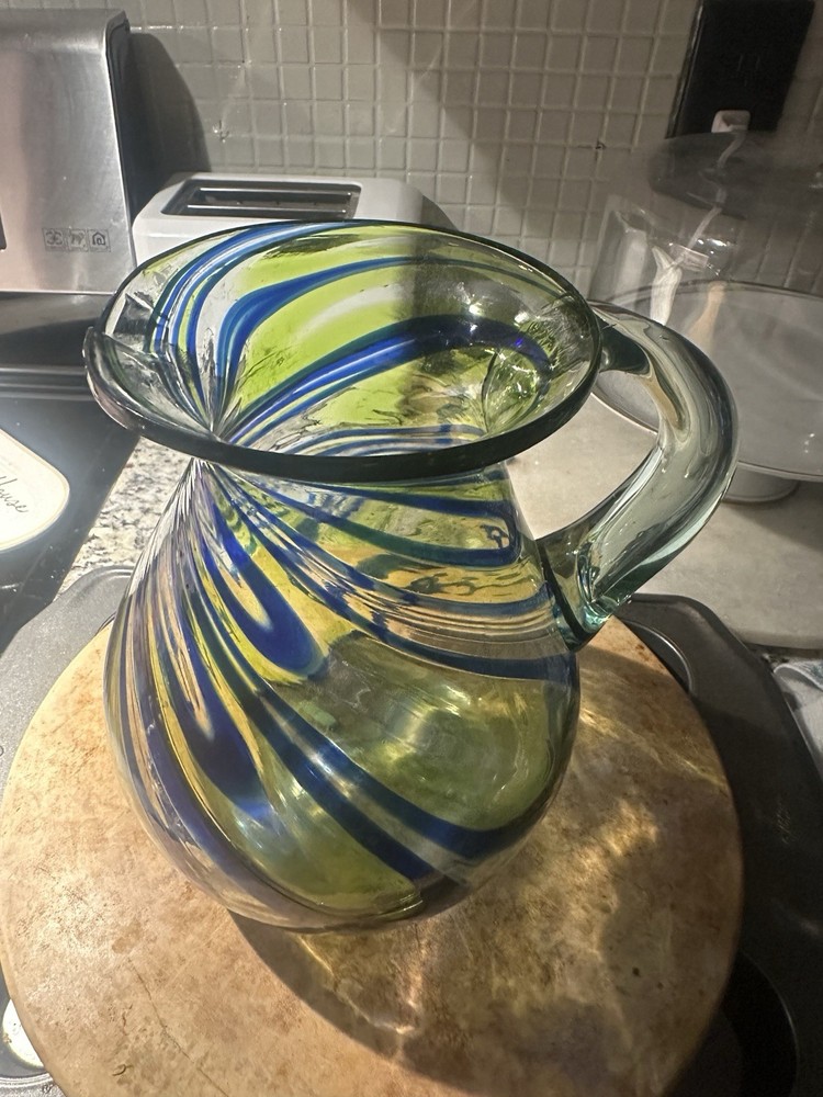 Add a touch of elegance to your drinkware collection with this stunning Souffle a la Bouche mouth-blown glass pitcher. The intricate swirl pattern and vibrant blue and green colors make this pitcher a unique addition to any occasion. Crafted from high-quality glass, this pitcher is perfect for serving your favorite beverages. The round shape and 9-inch height make this pitcher easy to hold and pour, while the 6-inch width ensures it can fit comfortably in your hand. This unisex pitcher is perfect for adults and can be used for any occasion. Whether you're hosting a dinner party or enjoying a quiet evening at home, this Souffle a la Bouche glass pitcher is sure to impress your guests.