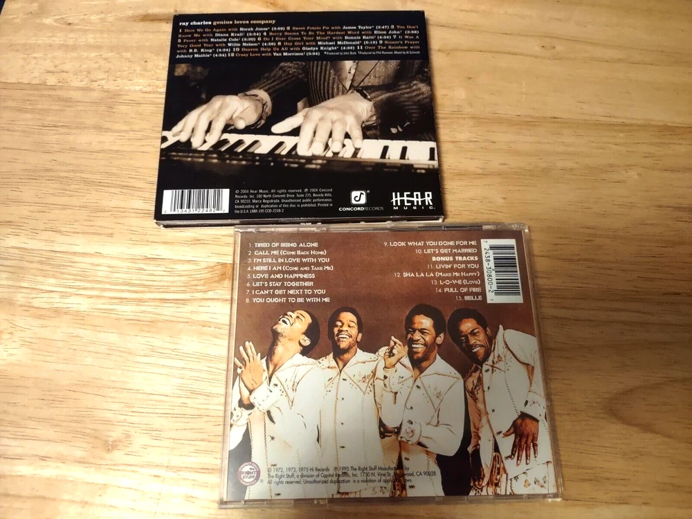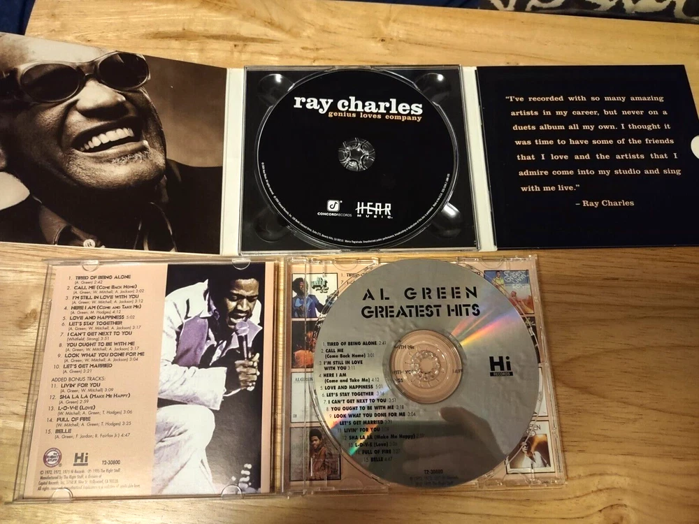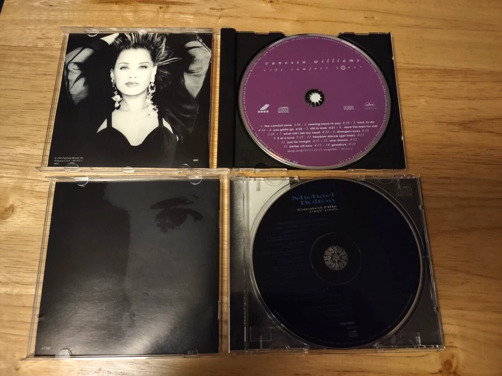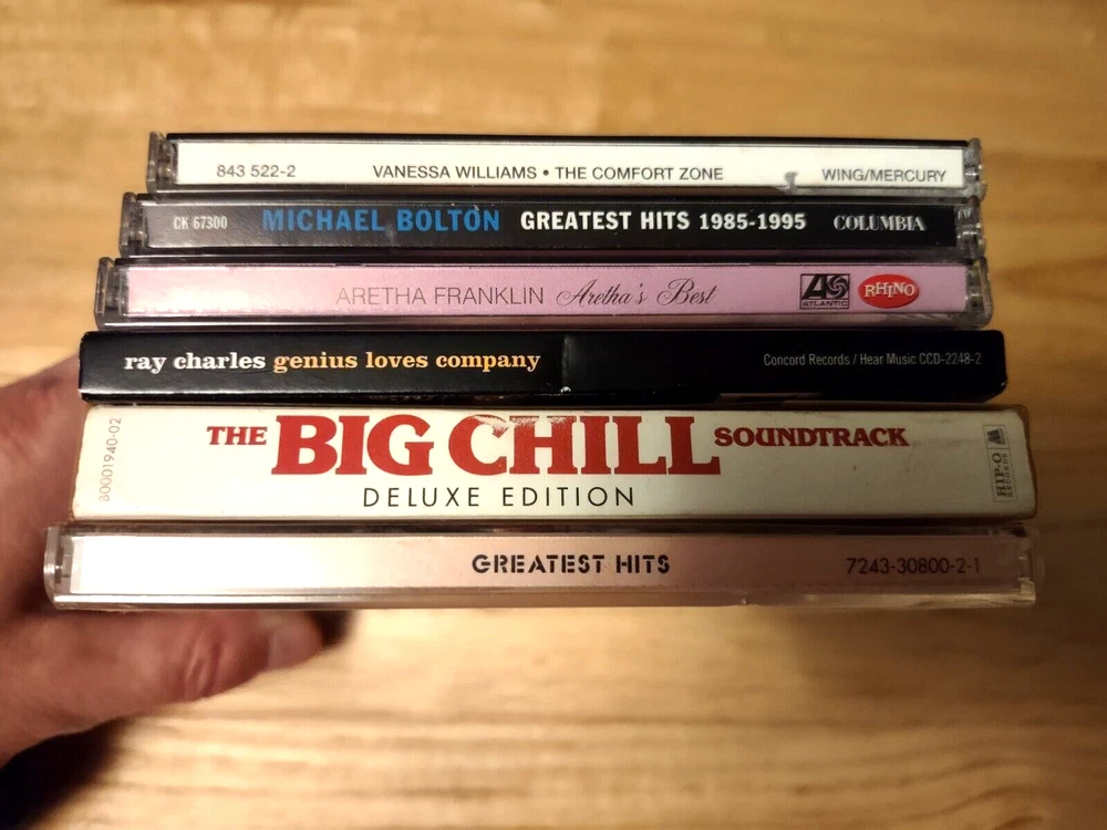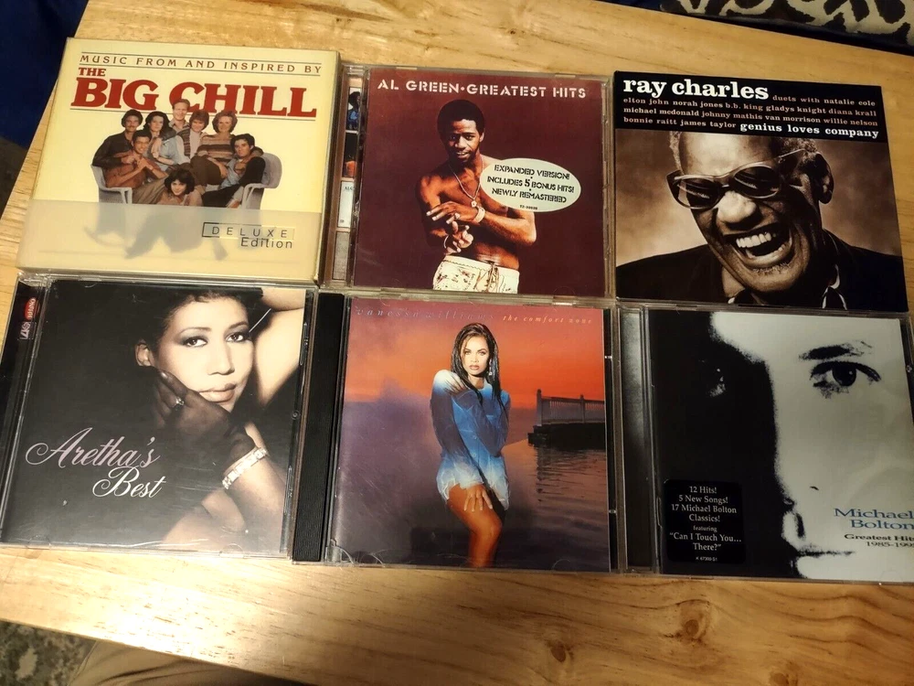 All CDs in great condition - see below for more detailed information. BX BR1 CD Lot contains: "The Big Chill" Soundtrack Deluxe Edition 2 CD 2004 Hip-O Records UPC 602498162286 CDs are scuffed and scratched, but plays with out any issues Al Green "Greatest HIts" w/ 5 bonus tracks CD 1995 The Right Stuff Records UPC 724383080021 Ray Charles "Genius Loves Company" CD 2004 Hear Music UPC 013431224822 Aretha Franklin "Aretha's Best" CD 2003 Rhino UPC 081227429522 Michael Bolton "Greatest HIts 1985-1995" CD 1995 Columbia UPC 074646730027 Vanessa Williams "Comfort Zone" CD 1991 Polygram UPC 042284352222