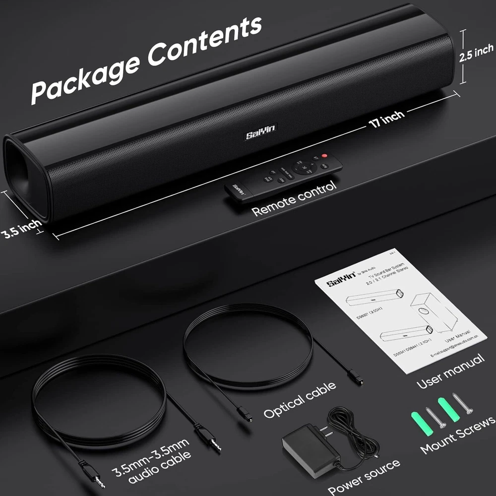Sound Bars for TV, 40 Watts Small Soundbar for TV,Surround Sound System TV Sound Bar Speakers with Bluetooth/Optical/AUX Connection for PC/Gaming/Projectors,17inch Compact yet Powerful: This 17-inch soundbar packs a punch with its ultra-compact design and 2 full-range speakers, delivering an immersive spatial audio experience for movies, music, and more. Versatile Connectivity: Connect the soundbar to your TV, smartphone, PC, or other devices via Bluetooth, optical, or auxiliary input, with support for an active subwoofer for enhanced bass. Optimized Entertainment: Tailor your audio experience with three equalizer modes (Music, Movie, News) that enhance dialogues, bass, and treble for a more realistic and engaging sound. Easy Setup: Mount the sleek soundbar on your wall with the provided mounting kit, or place it on your desktop – setup is quick and hassle-free. Fire TV Remote Compatible: Enjoy seamless control with the included remote or your existing Fire TV remote, adding convenience to your entertainment system. Speaker Maximum Output Power 40 Watts Frequency Response 20 KHz Connectivity Technology Bluetooth, Auxiliary, Optical Audio Output Mode Surround