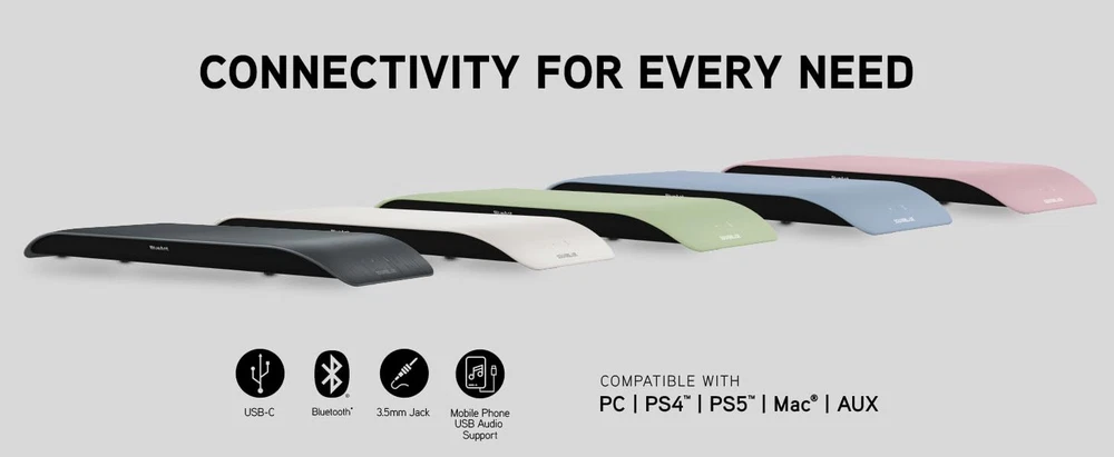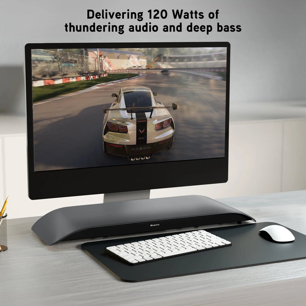 A Desktop Audio Powerhouse - Delivering 120 watts of thundering audio and deep bass, crystal-clear dialogue, rich music, and dynamic sound effects, the Soundblade provides an unparalleled desktop PC speaker experience for its form factor. Innovative Acoustic Engineering: Power and Clarity - Powerful 80mm neodymium subwoofer, dual neodymium drivers, dual voice coils, and single cone racetrack drivers, the Soundblade amplifies the power output while maintaining lower distortion levels, ensuring that every note and sound effect is delivered with crystal-clear precision. Epic Cinematic Experience and Enhanced Gaming - Streaming movie enthusiasts will appreciate a mini-cinema experience right at their desk, with the Soundblade capturing the full impact of cinematic storytelling. For gamers, the Soundblade offers an unprecedented level of immersion. It delivers heightened realism and auditory detail, bringing virtual worlds to life and allowing gamers to not only play the game, but be in the game. Award Winning Design - A beautifully crafted, sleek, low-profile device, The Soundblade complements and enhances any desktop setup. Its elegant form factor is specifically designed to integrate seamlessly under your existing monitor, creating a harmonious and unobtrusive addition to your workspace. Multiple Connection Options - The Soundblade offers a range of connectivity options to suit your needs. Whether you prefer the versatility of auto switching USB-C, Bluetooth convenience or the simplicity of a 3.5mm auxiliary input, the Soundblade seamlessly syncs with your laptop, MacBook, smartphone, or tablet.