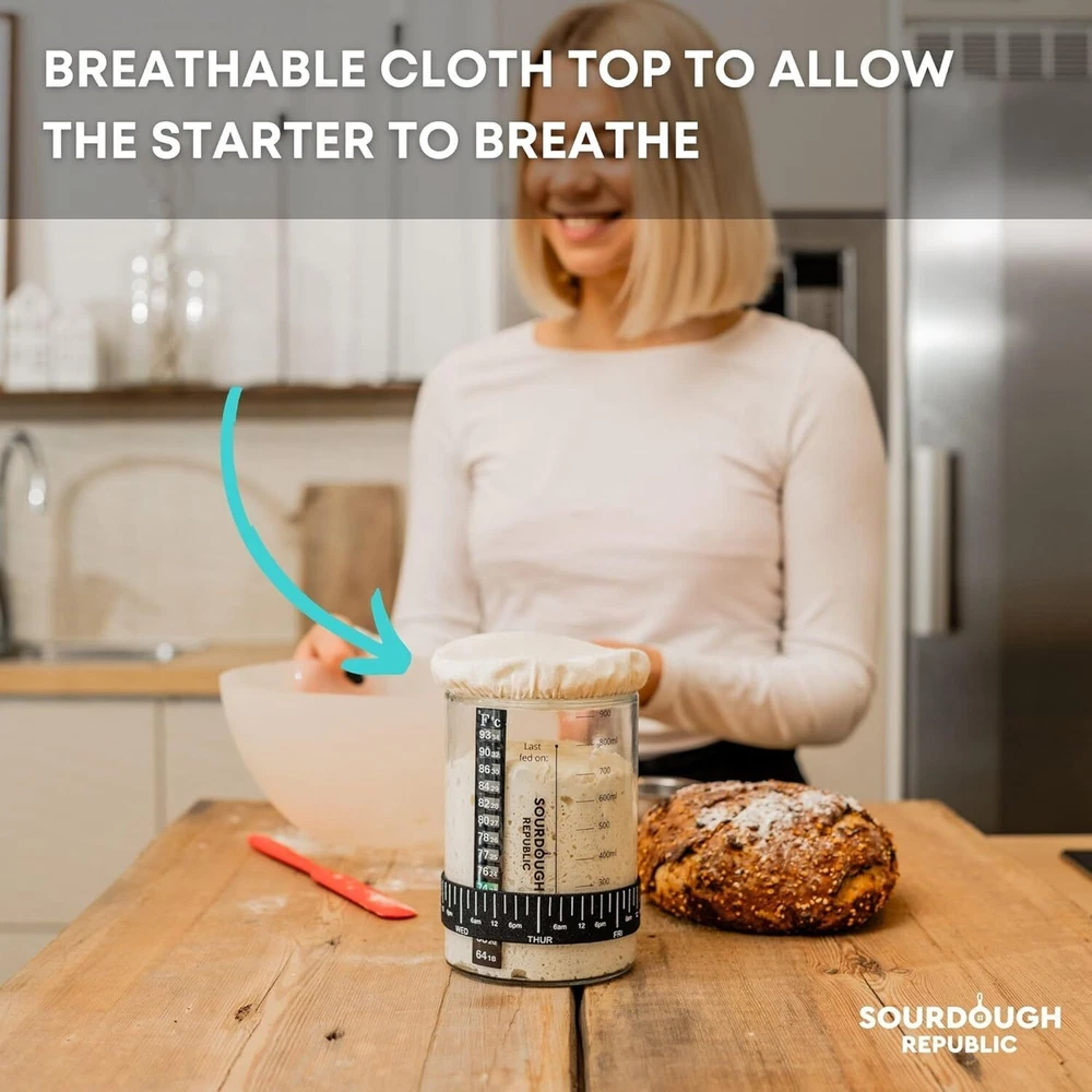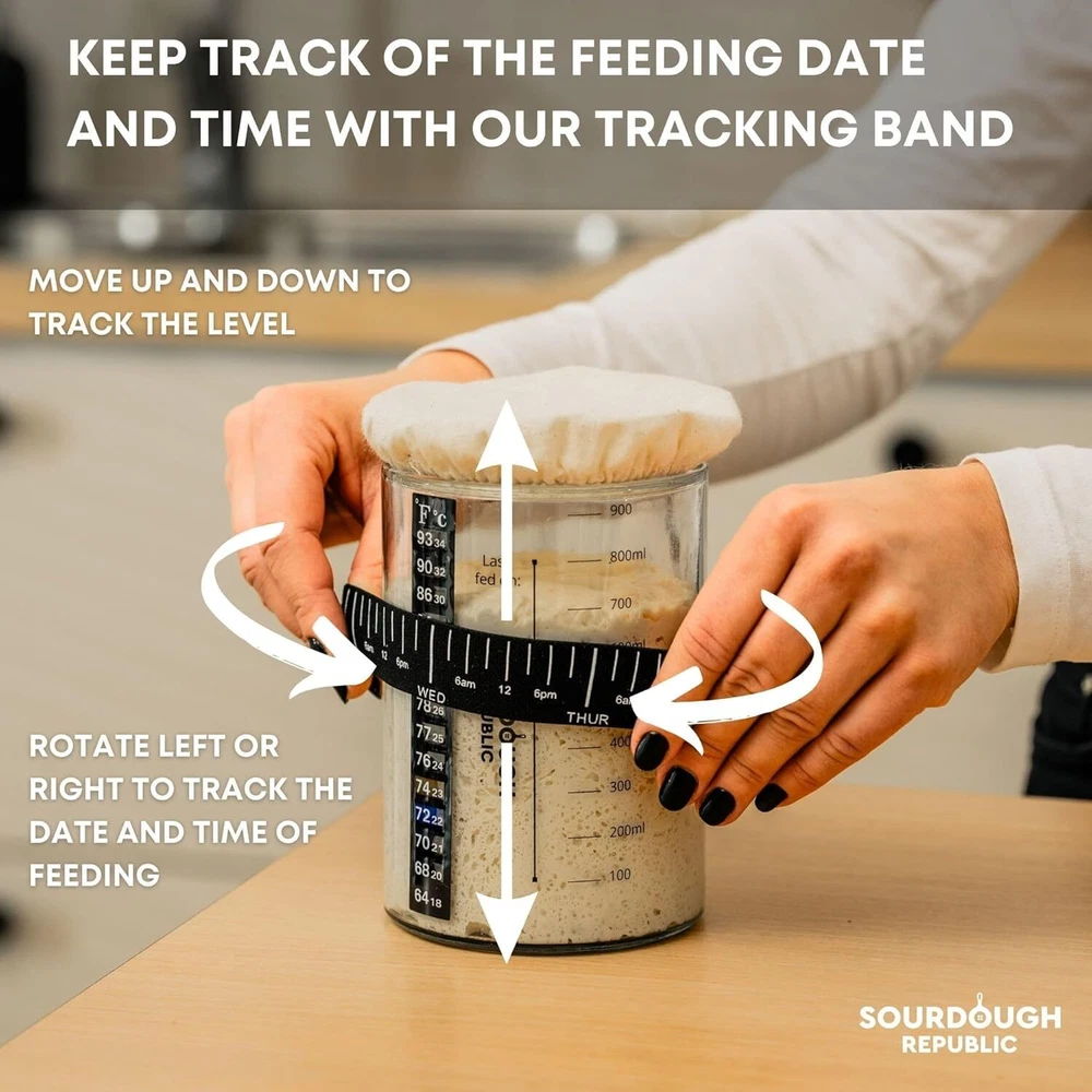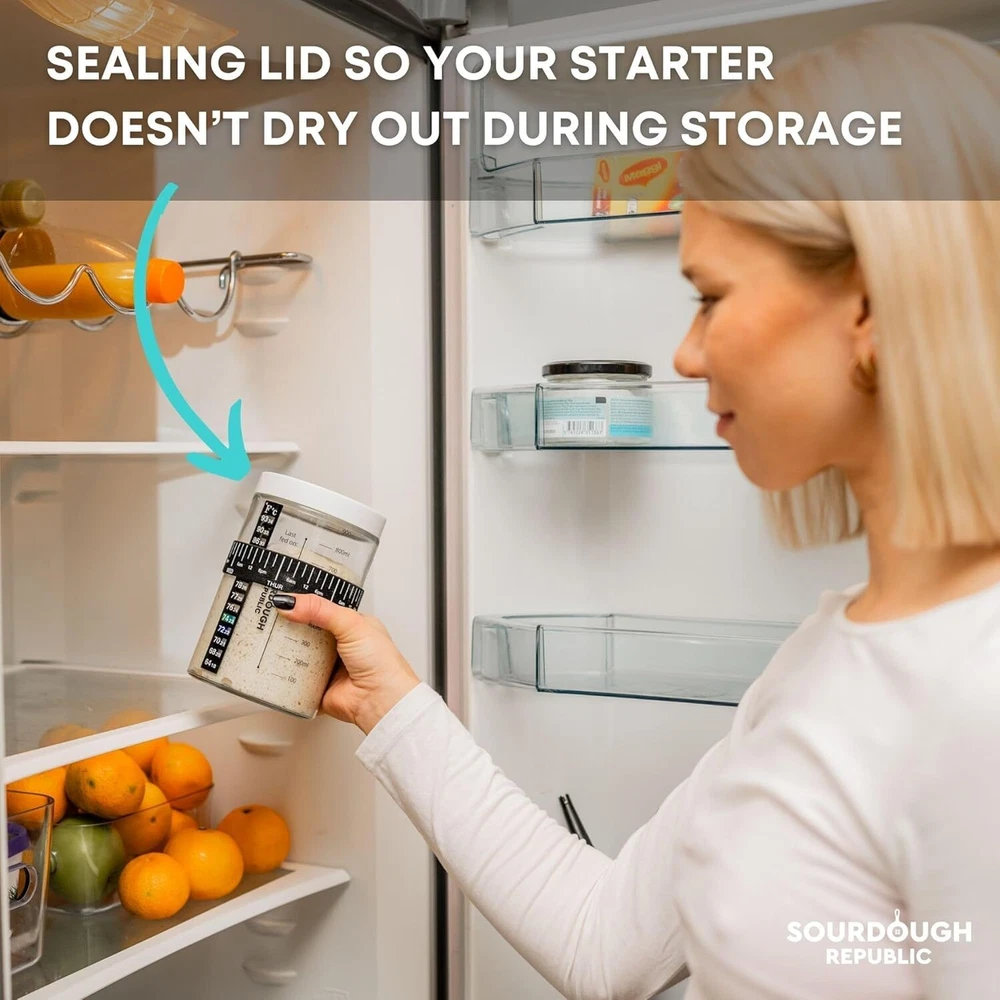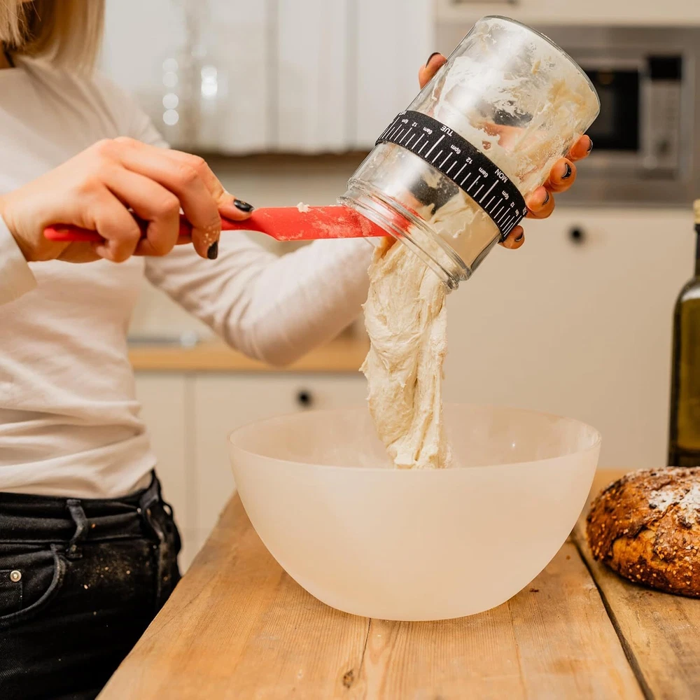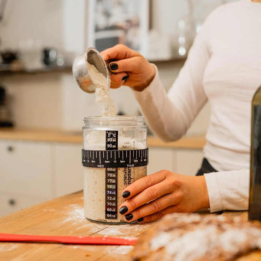 Sourdough Starter Jar Kit, 36 oz, Bread Baking Supplies, Clear Product Details Brand: Hemlock Home Brewing Color: Clear Material: Glass Material Feature: Food Grade, Reusable, Dishwasher Safe Capacity: 2.3 Pounds Create delicious and healthy sourdough bread with our all-in-one sourdough starter jar kit, perfect for bread enthusiasts and beginners alike. Sized perfectly at 36 oz this sourdough jar will always have enough room for your starter to activate and expand. Like you, we bake sourdough at home so we’ve included everything we’d want in a sourdough starter kit. Including a level tracking band to measure the height of your starter so you know when it is ready to add to your dough. The band also acts as a time and date measurement so you always know when you last fed your starter. We’ve also included other bread baking supplies such as a silicone spatula and temperature strip so you always know the temperature of your starter. Your sourdough kit will come with two different types of lids: one cloth cover to allow your starter to breathe during activation, and a plastic lid for fridge storage so your starter doesn’t dry out. Step-by-step instructions on how to create your first starter are included with each kit.