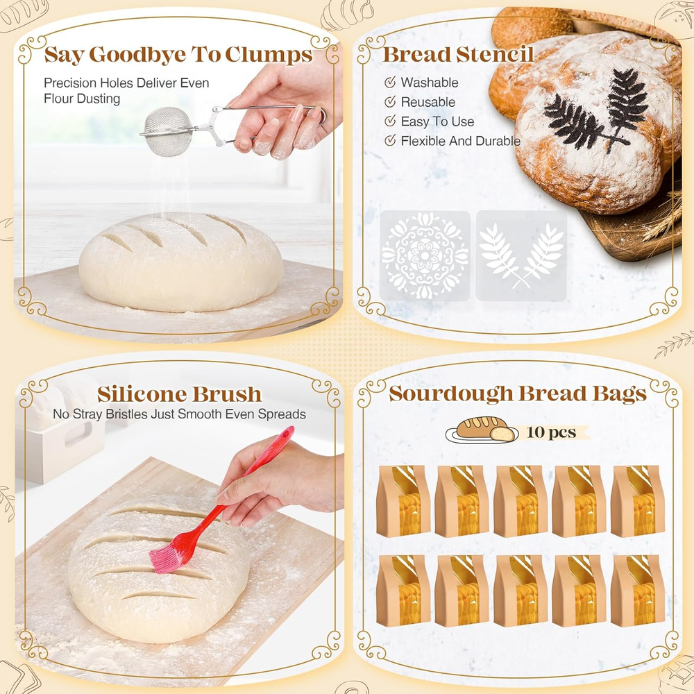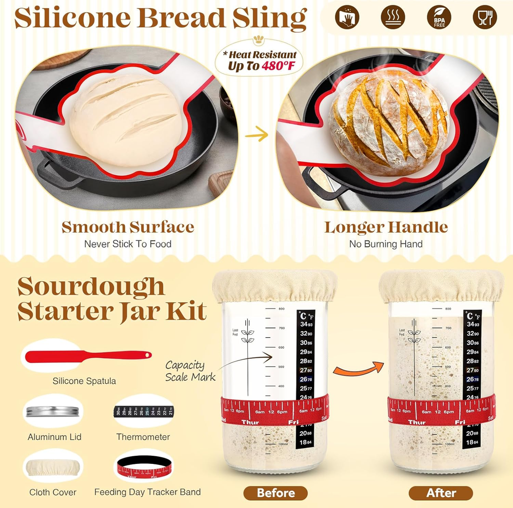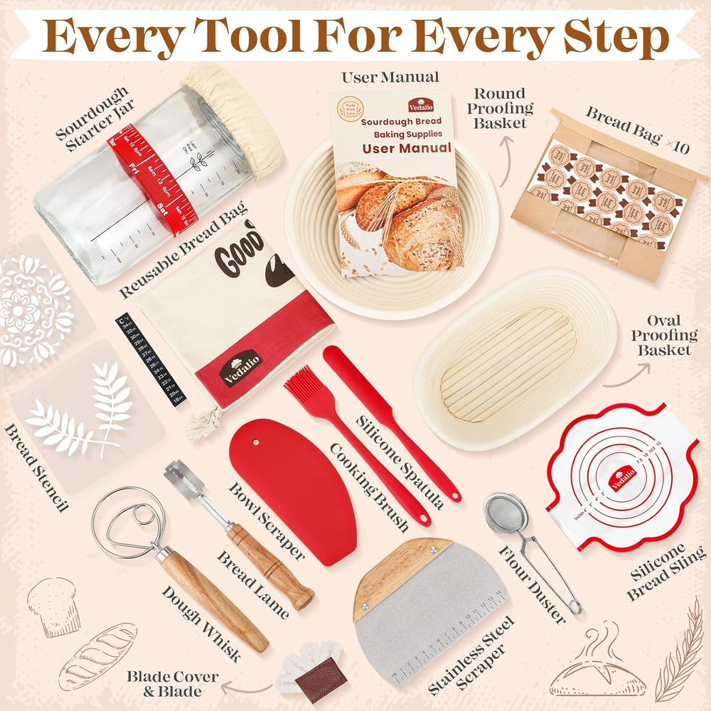 Store New Arrivals Add to Favorite View Feedback Contact Sourdough Starter Kit, Sourdough Bread Baking Supplies, Sourdough Kit Home and Kitchen, Sourdough Starter Jar, Sourdough Jar, Bread Proofing Basket, Sourdough Bread Basket, Sour Dough Kit Tools Description Item model number Sourdough Bread Baking Supplies Style Luxury Color Red Sour Dough Starter Kit With Sour Dough Starter Jars Product Dimensions 1"D x 1"W x 1"H Material Wood Handle Material Rattan Item Weight 1 pounds Shape Oval, Round With Lid No Finish Type Bread Making Tools Brand VEDALIO Manufacturer Sourdough Kit 🌾GET MORE FOR LESS - BEST VALUE SOURDOUGH STARTER KIT! Including Round Bread Proofing Basket (9 Inch) X 1, Oval Sourdough Proofing Basket (10 Inch) × 1, Sourdough Starter Jar × 1, Silicone Spatula X 1, Dough Whisk X 1, Bread Lame X 1, Blade X 5, Blade Cover × 1, Bowl Scraper × 1, Stainless Steel Scraper X 1, Flour Duster X 1, Silicone Bread Sling X 1, Cooking Brush × 1, Bread Stencil X 2, Bread Bag X 10, Reusable Bread Bag X 1, User Manual X 1. No need to buy piece by piece—this all-in-one bread making kit saves you time and money! 🥖BAKING MADE SIMPLE - You'll receive a detailed user manual that provides clear instructions on how to use sourdough tools. As an avid baker, I was really impressed with this sourdough accessories sour dough starter kit. The Flour Duster's precision holes distribute flour evenly without clumping. Bowl Scraper and Stainless Steel Scraper handle different dough consistencies. Even the Sourdough Jar includes measurement markings to take the guesswork out of fermentation. 🍞COMPLETE SOUR DOUGH TOOLS - The proofing baskets for sourdough bread baking are made of Indonesian rattan, which features a smooth, splinter-free finish that maintains your dough’s shape and leaves an elegant spiral pattern. They’re also easy to clean, which is important since I bake bread regularly. The chemical-free linen liner ensures safety and a non-stick surface for professional-quality loaves every time. With this professional sour dough kit, you'll be amazed at the restaurant-quality bread you can create at home. 🌟GREAT SOURDOUGH KIT FOR GIFTING - Whether for birthday gifts, housewarming gifts, or wedding gifts, this bread starter kit makes an impressive and practical present. Beautifully packaged and ready for gifting! The sour dough proofing baskets give your loaves perfect shape and texture, while our bread making tools help achieve that coveted crispy crust and airy interior. Why visit a bakery when you can create crusty, airy, Social Media-worthy sourdough bread at home? 🧀EVERYTHING YOU NEED FOR SOURDOUGH BAKING SUPPLIES - Turn the challenge of bread basket proofing into an enjoyable experience. With VEDALIO's expertly crafted sourdough bread tools, you can mix, proof, and bake without the mess or frustration. Everything is packed with care from our small business, because we believe baking should be simple, joyful, and rooted in tradition. Reach out if you have any questions, and we'll happily assist you. ✅OUR BAKING SET IS AN EXCELLENT CHOICE - The dough whisk is a nice touch for mixing the dough efficiently. Sharp blades for beautiful scoring patterns. The stencils allow for beautiful designs. And the silicone bread sling makes transferring the dough to the oven simple and stress-free. Proper storage with breathable bread bags for homemade bread. With these professional sourdough essentials, you'll be amazed at the restaurant-quality bread you can create at home. Product description DISCOVER THE ART OF HOMEMADE BREAD WITH VEDALIO The video showcases the product in use. The video guides you through product setup. The video compares multiple products. The video shows the product being unpacked. Sourdough Bread Baking Supplies Merchant Video THE COMPLETE SOURDOUGH STARTER KIT FOR PERFECT BREAD EVERY TIME EVERYTHING YOU NEED TO START YOUR SOURDOUGH JOURNEY Whether you're proofing, shaping, scoring, or baking, this bread proofing basket set includes high-quality supplies to ensure professional results. 1 Dough Whisk 2 Bowl Scraper 3 Stainless Steel Scraper 4 Bread Lame 5 Sourdough Proofing Basket OUR BREAD PROOFING BASKET IS AN EXCELLENT CHOICE Craft beautiful artisan loaves with our handmade sourdough proofing basket. VEDALIO SOURDOUGH BREAD MAKING KIT BEAUTIFULLY PACKAGED AND READY FOR GIFTING Perfect gift for bread lovers - beginners to pros. ABOUT US We offer the best prices around on high quality products. Our E-store includes media such as books, movies, music and games while offering electronics, toys, sporting apparel, clothing, tools, general home, garden items and more. SHIPPING We are always working hard to ensure your package arrives as soon as possible. Please understand that some factors like weather, high postal traffic, and the performance of shipping companies are outside of our control. We offer free shipping to the lower 48 states and ship within 2 business days of payment, usually sooner. We do not accept P.O. Boxes. Please provide a physical address. RETURNS We offer a 30-Day Return Policy on items which you are not completely satisfied with. You have the option for a full-refund or an exchange of the item. No returns are available on items shipped outside of the USA. PAYMENT We accept PayPal. CONTACT US This page content is yet to come Please ad us to your favorite seller and visit again later Thank You CUSTOMER SATISFACTION We try our very best to make sure every customer is completely satisfied. If there's a problem, message us! We're happy to help.
