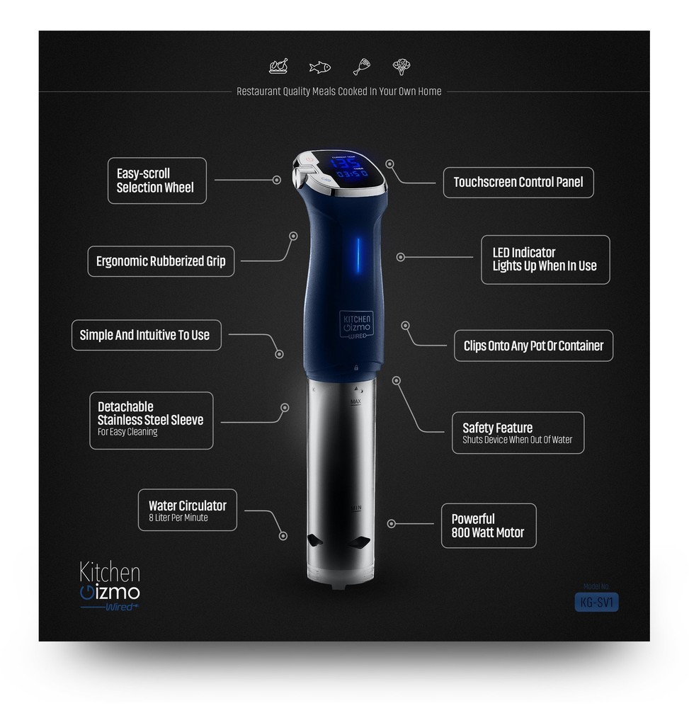 EASY TO USE: Remarkably intuitive with predictable results. This is the easiest and most delicious way to prepare food. CREATE RESTAURANT QUALITY DISHES: Once only an option for high-end eateries you can now create perfectly cooked dishes that look and taste amazing! RELIABLE AND QUIET OPERATION: Fits almost any pot with our strong-grip clip. Cooks precisely and quietly with temperatures up to 194 F and a +/- margin of error of less than 1 F. ETL approved HIGH-END FEEL - LOW-END MAINTENANCE: Removable sleeve allows for easy cleaning. Choose the correct time and temperature easily with the smooth scrolling selection wheel. FREE BONUS: We included a cookbook with tried and true Sous Vide recipes for every dish that will impress you and your guests. For the more daring chef we have included a handy chart to help you figure out the right temperature and cook times.