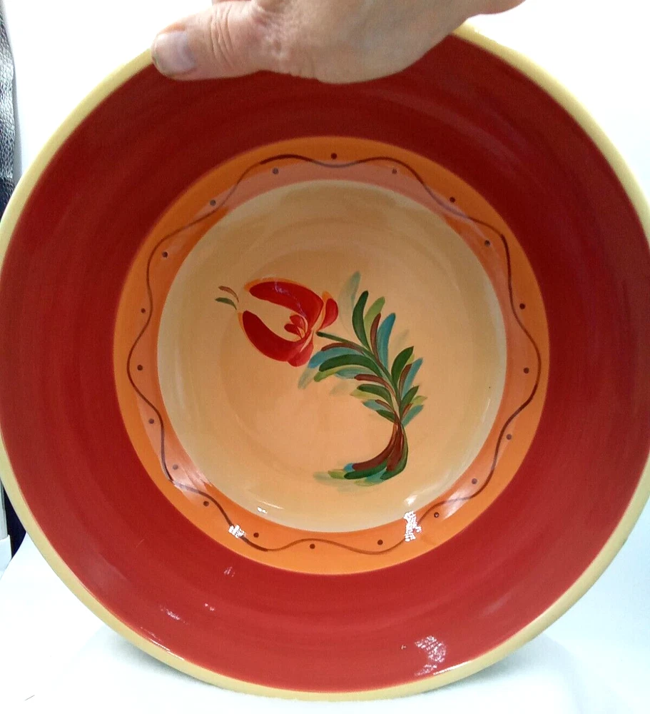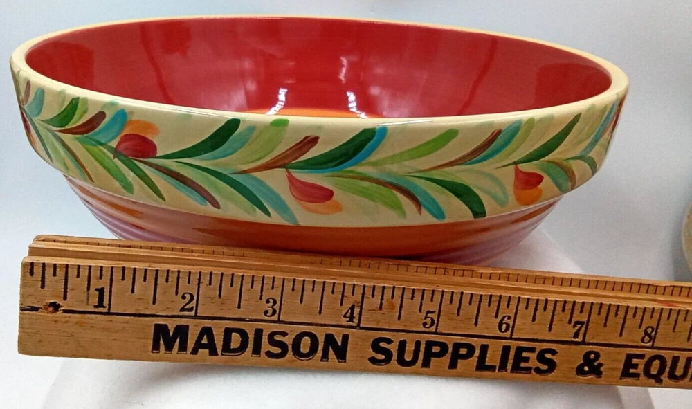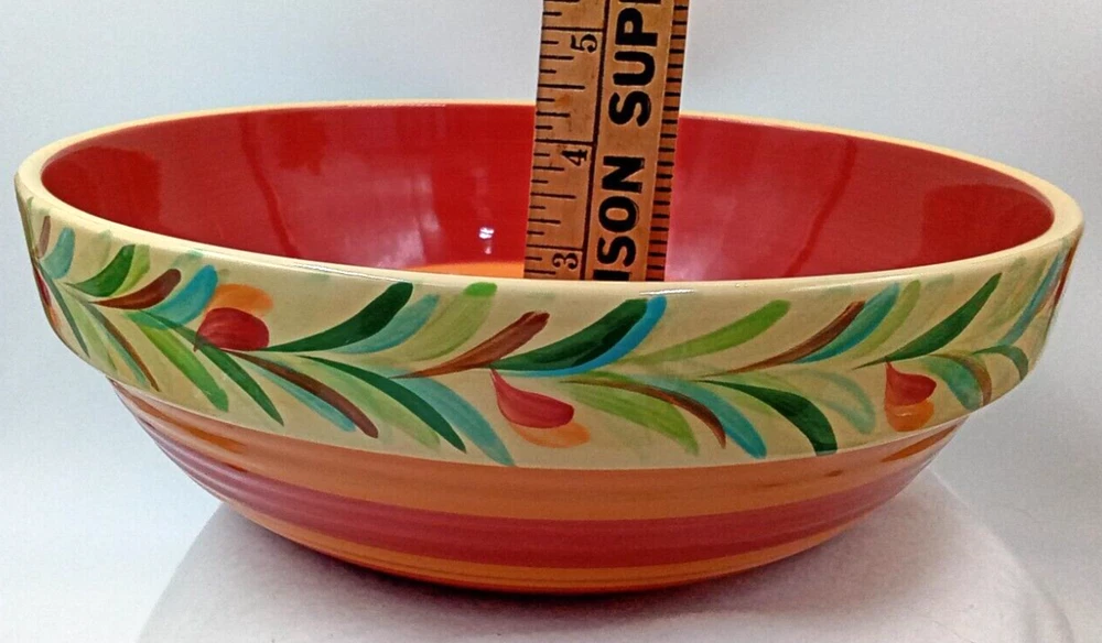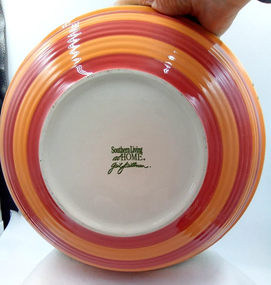 Shape: Round Finish: Glossy Antique: No Era: 21st Century (2000-now) Color: Yellow Production Technique: Pottery Product Line: Gail Pittman Original/Licensed Reproduction: Original Production Style: Art Pottery Handmade: No Department: Adult Theme: Food Occasion: All Occasions Style: Contemporary Brand: Southern Living at Home Type: Serving Bowl Seller Notes: “Very Handy Bowl! No Chips or Cracks! Great Shape! Pre-owned!” Pattern: Siena Time Period Manufactured: 2000-2009 Country/Region of Manufacture: Unknown Features: Decorative, Stackable Vintage: Yes Material: Stoneware