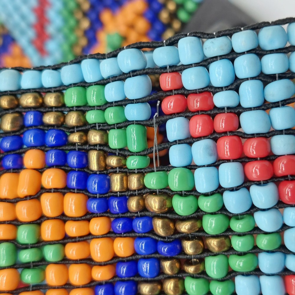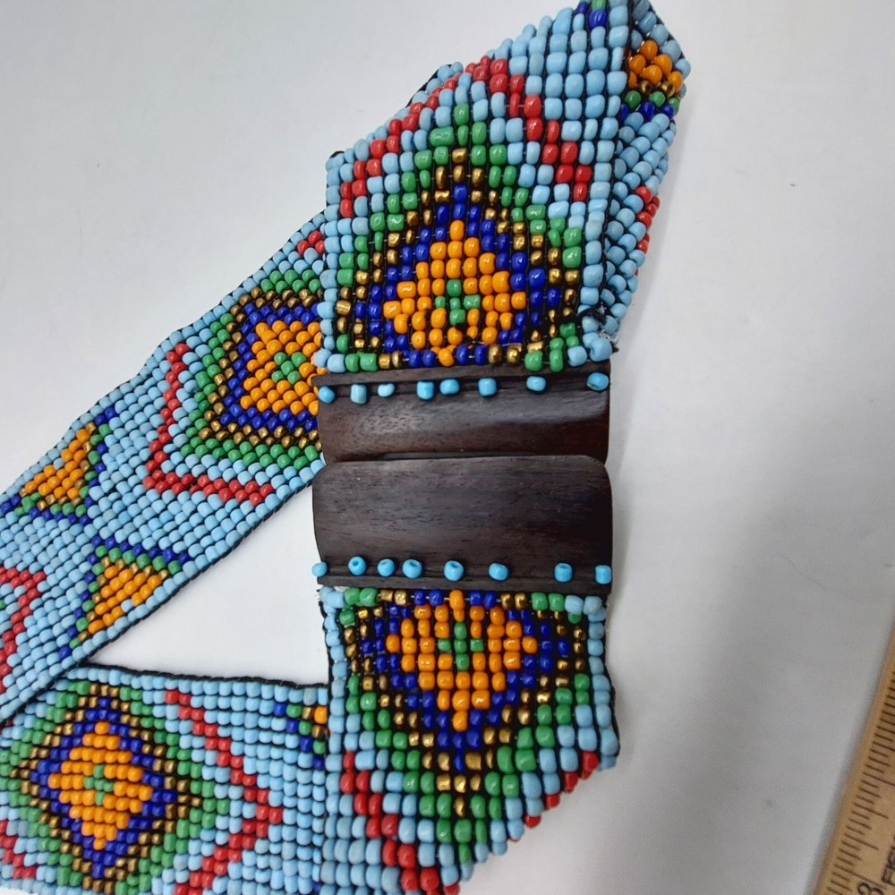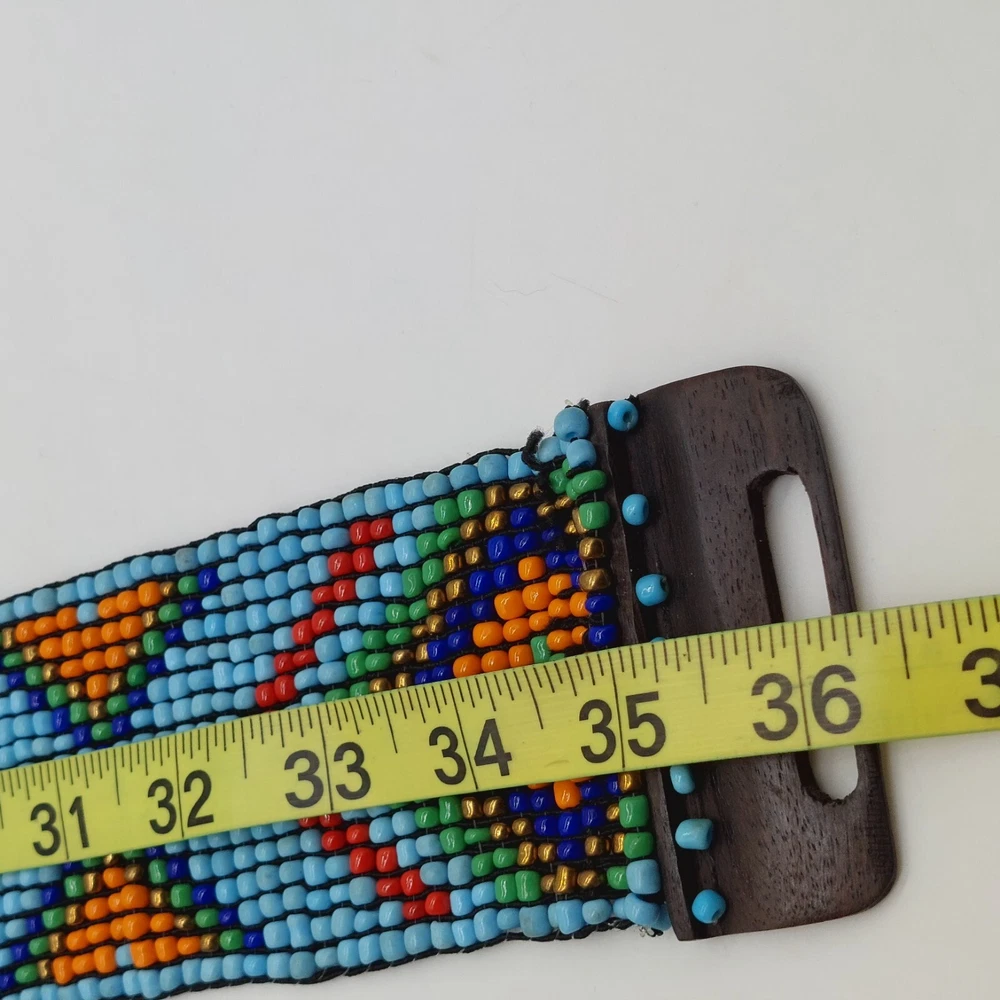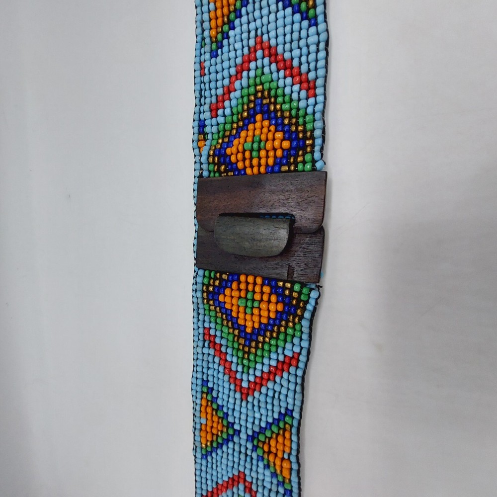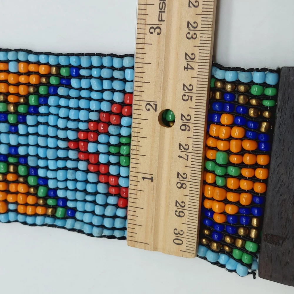 Southwest Blue Beaded Wide Stretch Belt with Wooden Clasp Multi-Colored Design