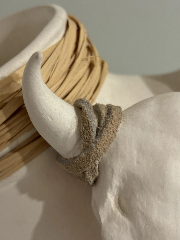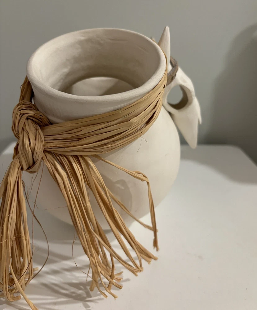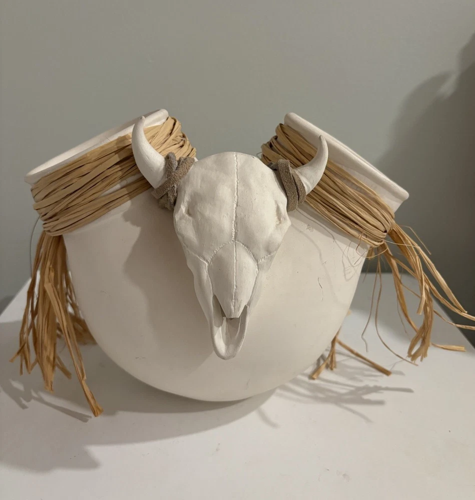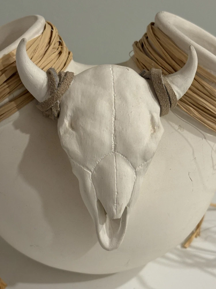Southwestern style double opening vase with a unique steer skull. The skull horns are decorated with rawhide. There are two openings to the vase that are adorned with raffia. The vase is signed Lovegrove. The bottom has felt circles on bottom that can be removed. They cover part of signature. The vase measures approximately 9” wide by 7” tall. It is preowned and in very good condition There is a small black mark on back as indicated in photo. Unique piece.
