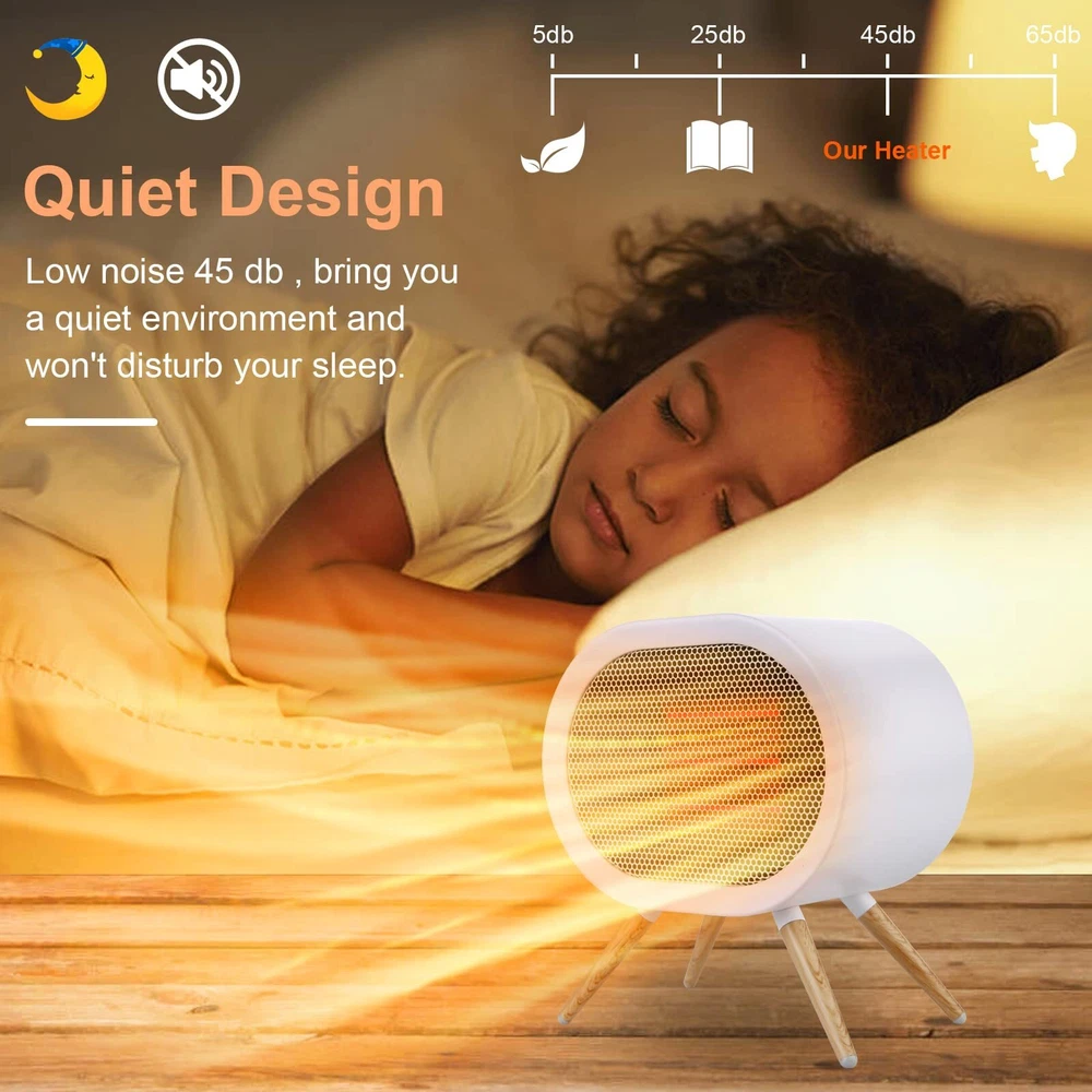 Safer to Use: The small space heater has overheating & tipped over protection. The ceramic heater shuts off after 6 hours of use to protect the heating plate. Automatically power off when dumping. Make heating safer 3 Adjustable Heating Mode: Our portable desk heater has 3 modes: 1000W high heat(H), 500W low heat(L), natural wind(F), heats up space or room quickly, bring you proper warmth as you need Energy Efficient: This space heater for office provides faster and more efficient heating, reduces energy consumption. It’s quite small, but does a good job of heating space which also can help lower your energy bills Durable Material: Our small heaters for indoor use adopt latest fire-resistant materials, PTC ceramic heating element make this desk heater more durable and more effective faster heating, this heater fan can heat up in 2 seconds. Low noise 45 db. Cute and Stylish Design: Simple and elegant appearance design makes this small heater looks more modern and aesthetic. Not only a mini electric heater, but also as homer décor. The upgraded 4- plastic-leg with bottom non-slip silicone design is more stable than three leg, not easy to falls over Portable Mini Space Heater: 7 x 4 x 8 inches, small and space-saving. Compact size make this ceramic heater easy to fit anywhere or move around. First option as a winter Christmas gift