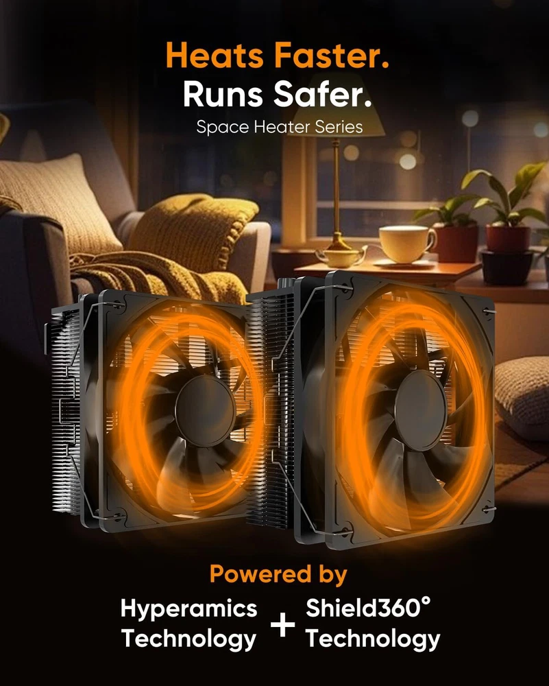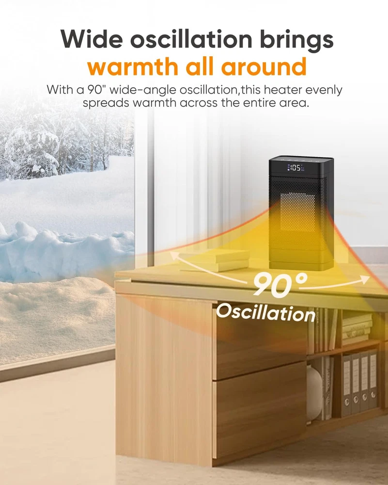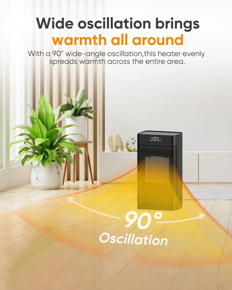 GET NICE & TOASTY FASTER: PGYIOO! space heaters combines 1500W advanced PTC ceramic system with a new heat funnel design to deliver heat within 2 seconds. Just turn on your space heater, count to 2, and enjoy your warm living room, bedroom or office, can quickly heat an area of 200 square feet. Comprehensive Safety Features: PGYIOO! heaters for indoor use are made of ABS flame retardant material and reinforced safety plugs to avoid any fire hazards. When the heater overheats, the overheat protection system turns the heater off. The tip over protection system will also turn off the heater, and when the heater is accidentally knocked over, it will automatically return. Quiet Heating: Brushless DC motor and 12 aerodynamic blades smooth out airflow and eliminate air turbulence, delivering soft, tranquil warmth. Quiet to 35 dB, 20% quieter than traditional electric heaters, you can sleep or work peacefully. Multiple heating modes: With various modes (High/Medium/Low/ECO/Fan Only), the heat comes in many forms, from powerful heat to more energy-saving ECO heat. Remote control and 1-12 hour timing function can make your life more convenient. Uniform Heating: PGYIOO! portable heater can reach a maximum temperature of 105°F,and the 90° wide-angle oscillation, with a lifespan of over 750,000 cycles, boosts heating coverage by 20%, which helps distribute the warm air more evenly towards the room's corners.