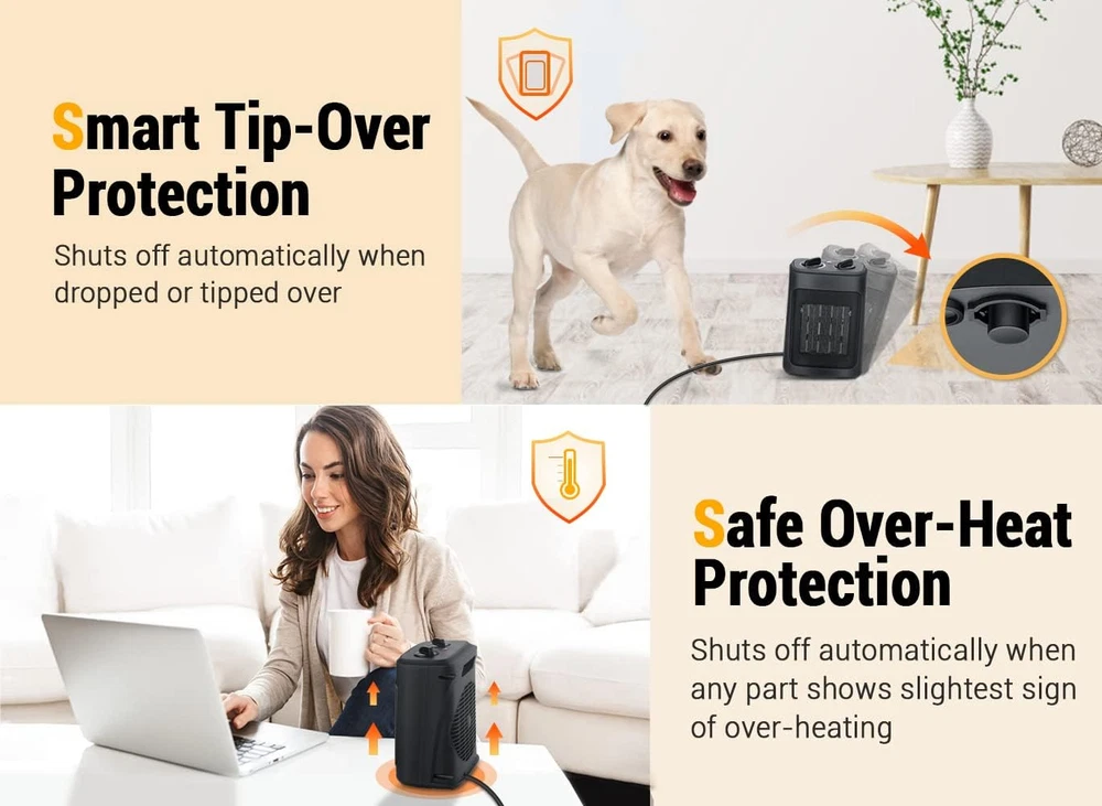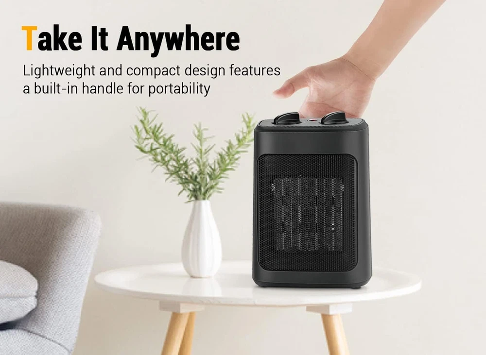GET NICE & TOASTY FASTER: The advanced PTC ceraming heating technology combined with the ultra-efficient fan will heat up any space faster and distribute the heat more evenly. Just turn on your space heater, count to 3, and enjoy your warm living room, bedroom or office. CUT DOWN ON ELECTRIC BILLS without having to freeze. Our energy-efficient interior space heater features 3 different heat settings (LOW, MEDIUM, HIGH) as well as a fan-only mode, so you can tailor it to your exact needs. Instead of wasting a fortune on central heating, you can warm just the spaces you actually use. ADJUST THE TEMPERATURE TO YOUR NEEDS: Equipped with an adjustable thermostat, our space heater will keep you comfortable at all times. Just set the dial to the desired heat setting and let the thermostat monitor the surrounding air temperature and keep you comfy. PERFECT FOR YOUR HOME OR OFFICE: The compact and portable design combined with the ergonomic built-in handle, will allow you to easily move your space heater to any room you want. Make sure your office, kitchen, bedroom, guest room, study or living room is nice and warm. YOUR PEACE OF MIND IS OUR PRIORITY: We have ensured the safety of you and your loved ones by adding an advanced overheat protection sensor as well as a smart tip-over switch, which will automatically turn off the heater in case it overheats or gets tipped over by your kids or pets. NOTE:Before purchasing the heater, please check the User Guide in the Product Guide and Documentation. Product Description Go From Chilly To Toasty In 3 Seconds! Now you don't have to settle for costly central heating or cheaply-made space heaters anymore. The Aikoper space heater is here to take all the fuss out of heating your home or office. The 3 different heating modes (Low, Medium & High) combined with the fan-only function and adjustable thermostat will help find the ideal temperature for every occasion. Plus, ultra-convenient portable design will allow you to take it with you everywhere. Advanced Safety Features Rest assured that your space heater comes equipped with state-of-the-art safety features, which include a smart tip-over protection feature and a reliable overheat protection feature for your peace of mind. Specification: Model No.: NT15-20A Voltage: 120V, 60Hz Thermostat: Yes Package Dimensions: 6.77x5.59x9.17 inch Product Dimensions:6.4D*4.8W*9.09H in Fan Speed:2500rpm (One Speed) Perfect For All Four Seasons! Use the Low setting in spring, the Medium setting during chilly fall months, the High setting in winter, and cool off during summer with the fan-only mode. Lightning-Fast Heating Function! You will not even get to three-Mississippi and your office or bedroom will be nice and toasty. That's how fast this space heater will work! Tip: Use at a distance of 1.8 feet for better warmth. Handy Adjustable Thermostat! Take the guesswork out of controlling your space heater and adjust it to the comfortable temperature you and your loved ones want. Save Precious Desktop Real Estate! Boost your productivity and enjoy the warm air by placing your compact space heater on your coffee table or office desk. <45dB Sound Level! Ideal for reading, working, listening to music, watching TV, doing homework, taking a nap or sleeping at night, our low noise space heater will not disturb you, your kids or your neighbors. Reliable Safety Features! This electric space heater comes with an ETL certification, which ensures that it is safe for daily use. Perfect for families with curious pets and active toddlers, our easy-to-use space heater features tip-over and overheat protection.