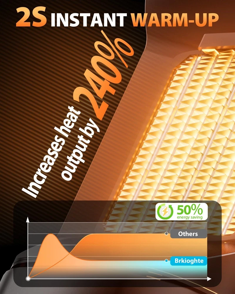 Faster Heating:The space heater for indoor use combines an advanced PTC system with a new heat funnel design to provide heat within seconds and enhance warm air circulation, heating up to 240% farther than traditional heaters Safe Design: This space heaters for indoor use come with an innovative tilt detection sensor that improves accuracy and reliability for better tip-over protection, and features V0-rated flame-retardant material, overheat protection, and a safety plug Compact and Powerful: This portable heater build in carry handle and powerful heat that fits everywhere. providing precise and comfortable warmth. The 80° wide-angle oscillation covers the entire area, offering widespread heat for your bedroom, garage, basement, office, desk, and more Multi-modes: This Smart electric heater equipped with multiple heating levels and modes to heat as you like. (Digital Display, 1-12H Timer, Negative ion mode and Fan Mode) Quiet and Efficient: The portable heater adopts silent fan design, and the working sound is less than 25 decibels, which will not affect your work and sleep. 12 hours timing design, you can turn the heater on and off when you need it
